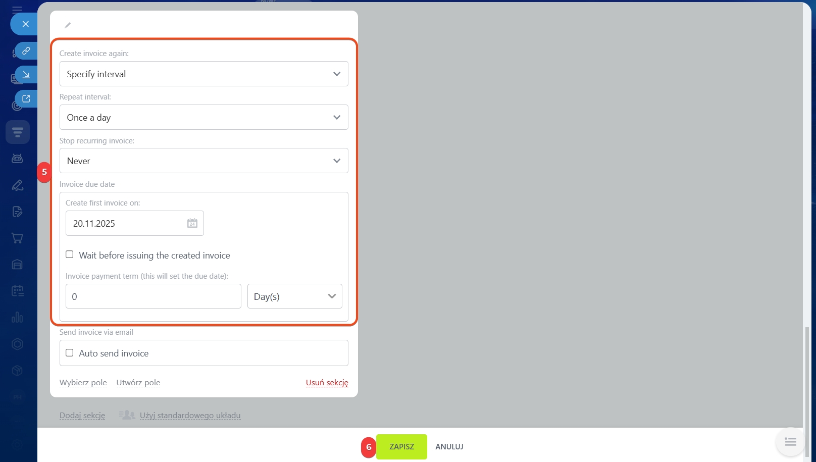 - Regularnie — CRM będzie automatycznie tworzyć faktury zgodnie z harmonogramem — na przykład co tydzień lub co miesiąc.