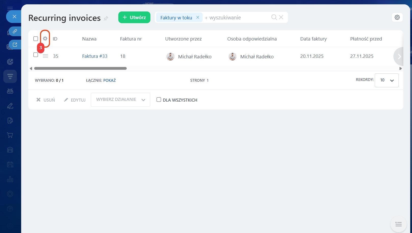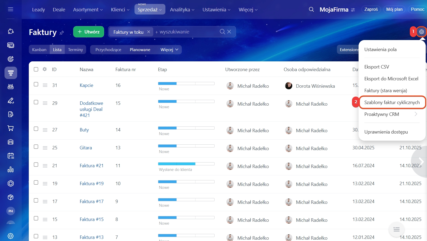 - Po utworzeniu faktury cyklicznej CRM zapisuje ją jako szablon. Aby zobaczyć wszystkie faktury cykliczne, przejdź do Ustawienia (⚙️) > Szablon faktur cyklicznych.