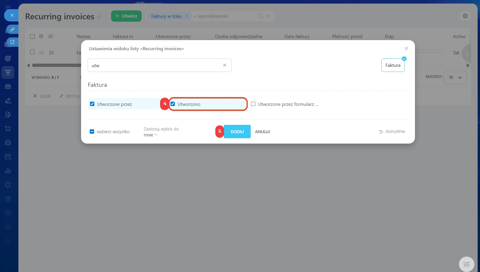 Przejdź do CRM > Sprzedaż > Faktury i kliknij Utwórz. W formularzu faktury w sekcji Faktura cykliczna wypełnij pola.