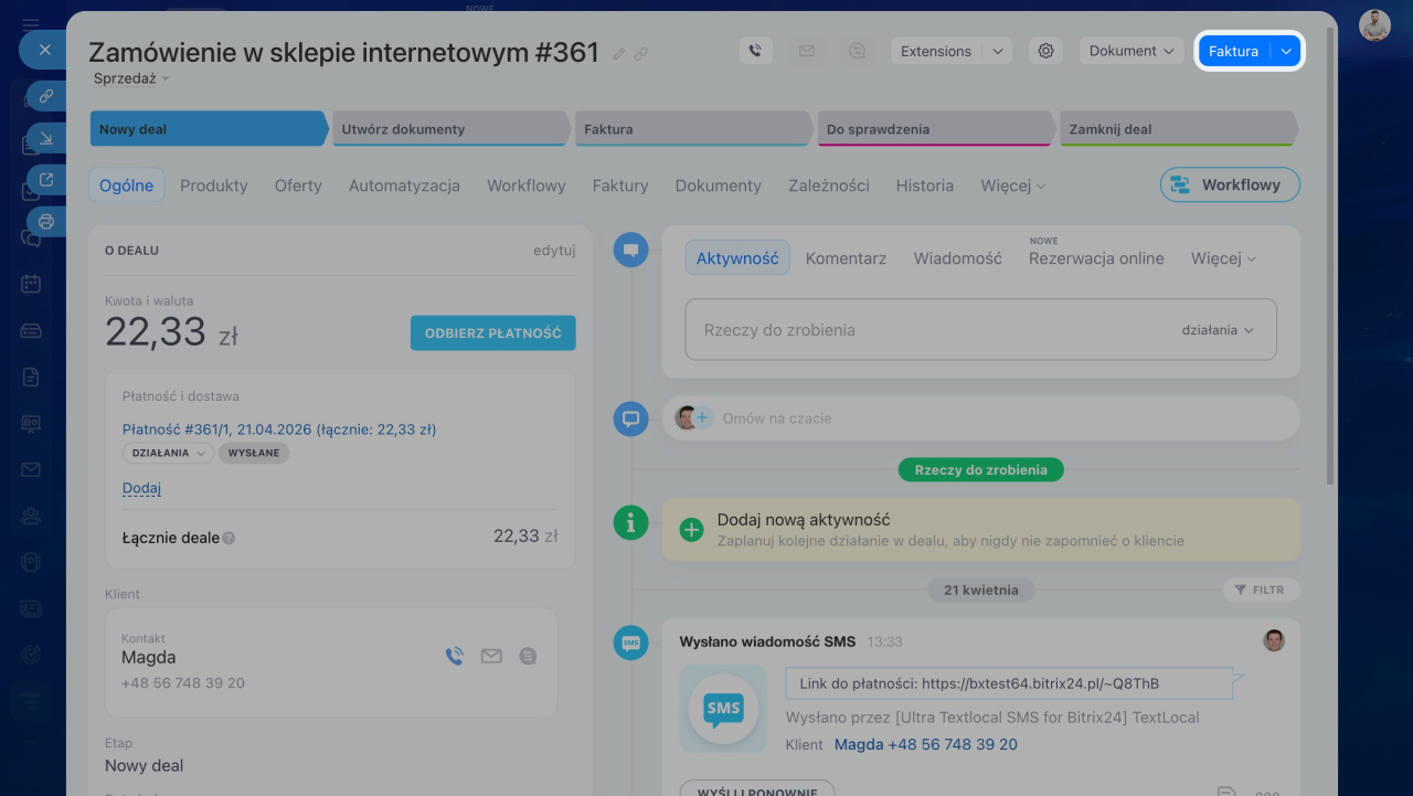 Faktury cykliczne pomagają pamiętać o powtarzających się płatnościach klientów — na przykład za wynajem, usługi lub subskrypcje. CRM tworzy i wysyła takie faktury automatycznie — zgodnie z ustalonym przez Ciebie harmonogramem. Klienci otrzymują przypomnienia o płatnościach na czas, a Ty oszczędzasz czas na rutynowych działaniach.