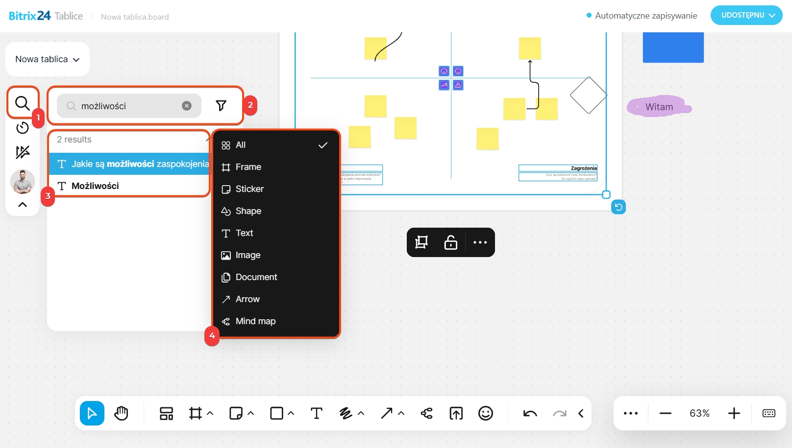 Wyszukiwanie – pomaga znaleźć na tablicy potrzebne obiekty według słów kluczowych i typów elementów.