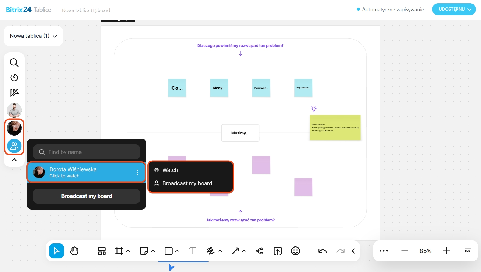 - Obserwuj — automatycznie przesuwa tablicę na Twoim ekranie do obszaru, nad którym pracuje dany użytkownik, i dostosowuje jej powiększenie.