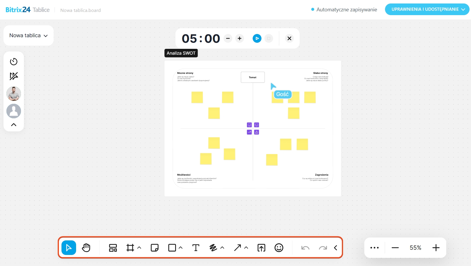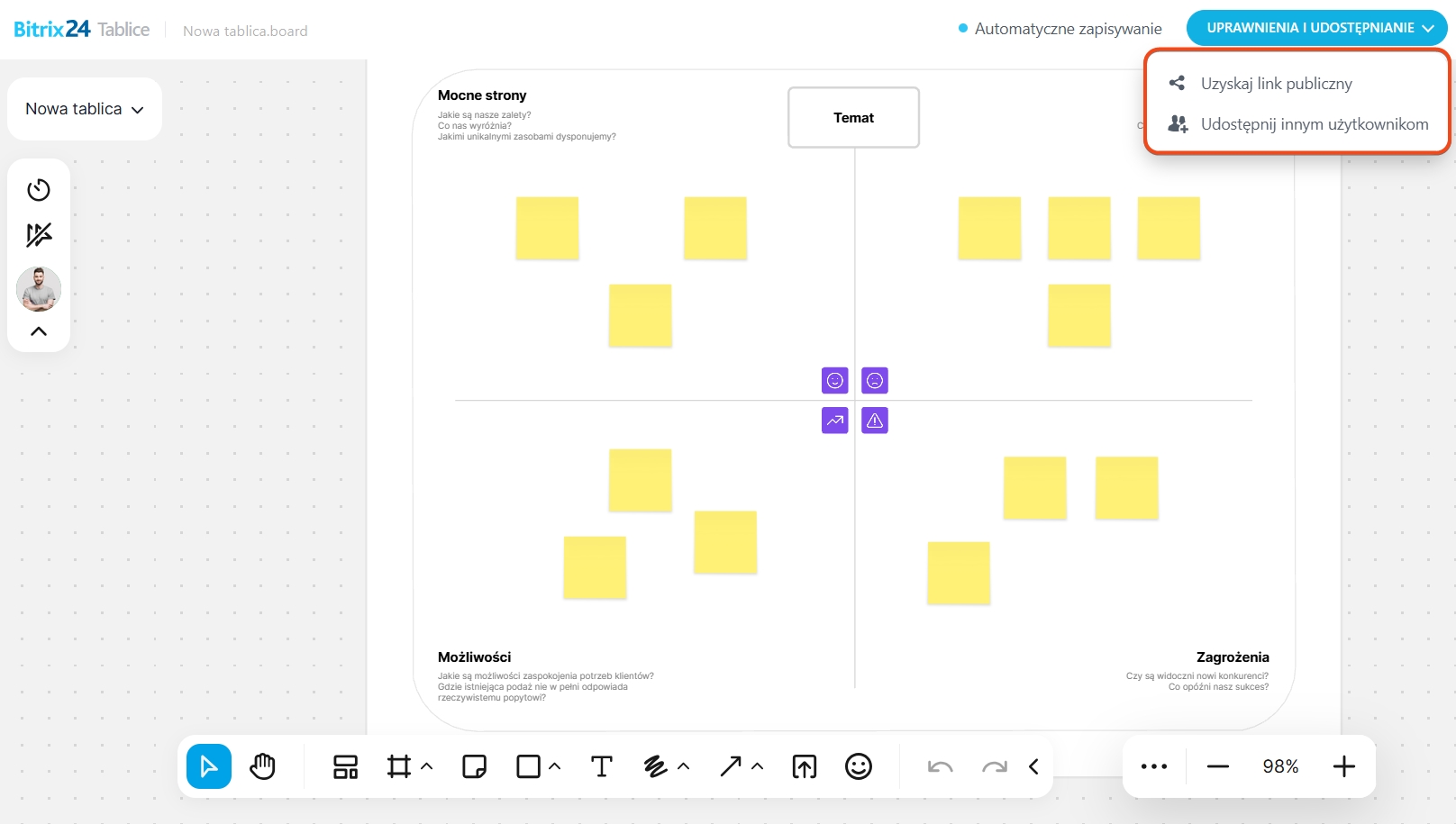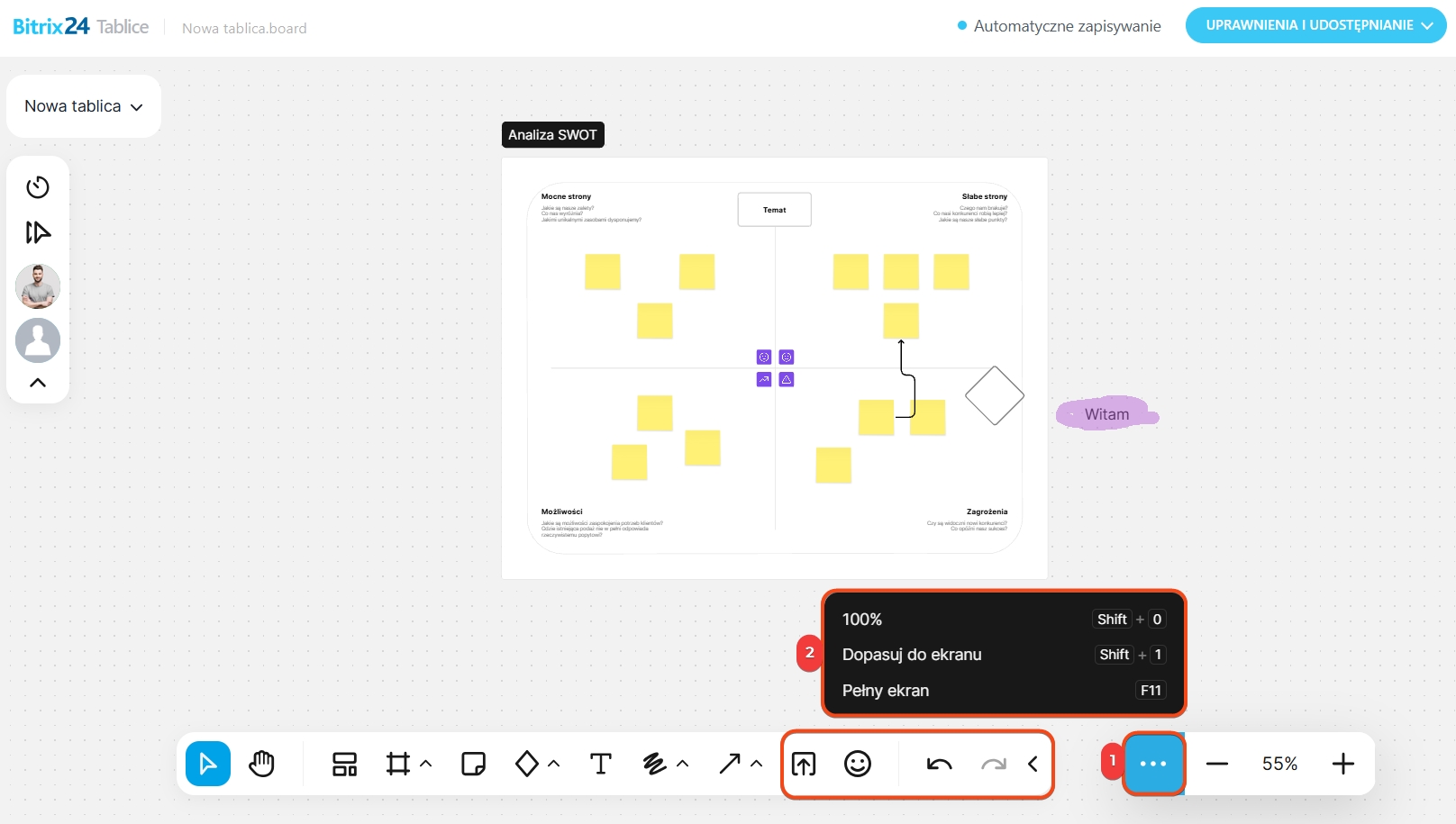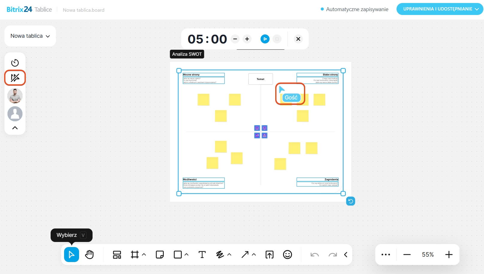 - Wszystkie zmiany zapisywane są automatycznie: uczestnicy widzą aktualizacje w czasie rzeczywistym i mogą zostawiać komentarze bezpośrednio na tablicy.