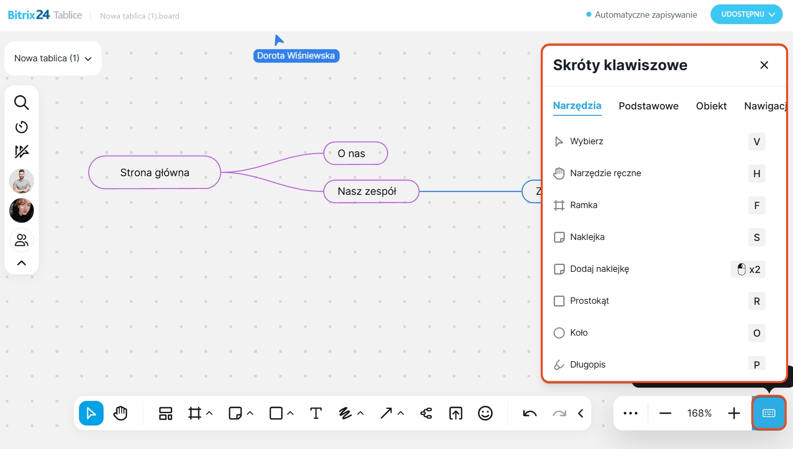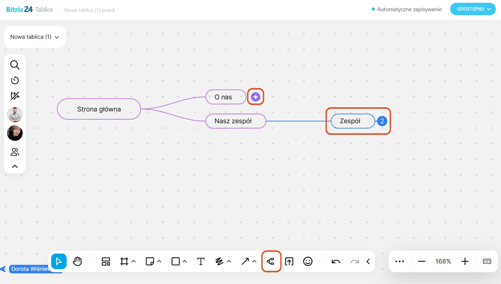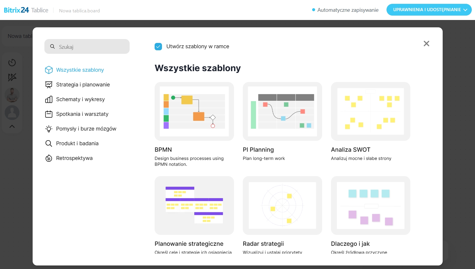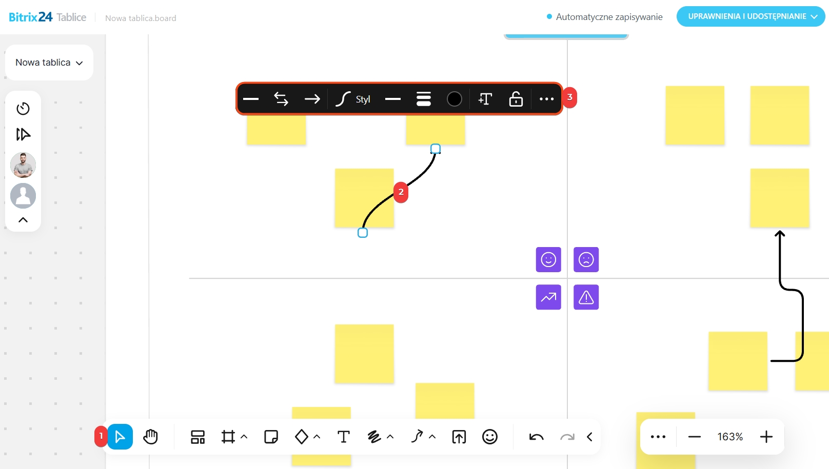 - Wszystkie zmiany zapisywane są automatycznie: uczestnicy widzą aktualizacje w czasie rzeczywistym i mogą zostawiać komentarze bezpośrednio na tablicy.
