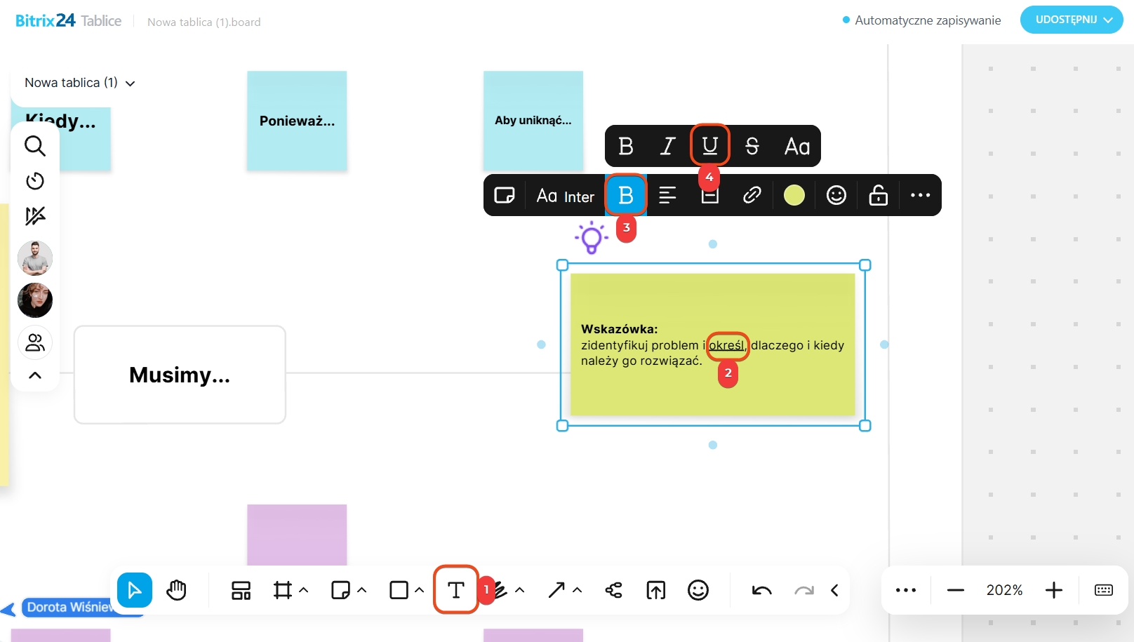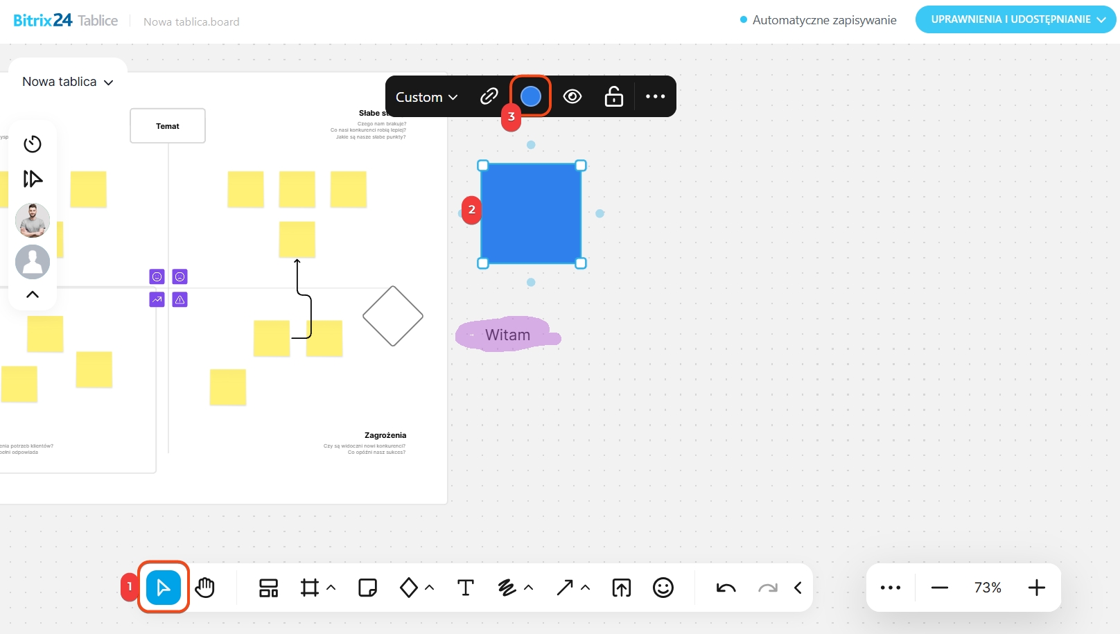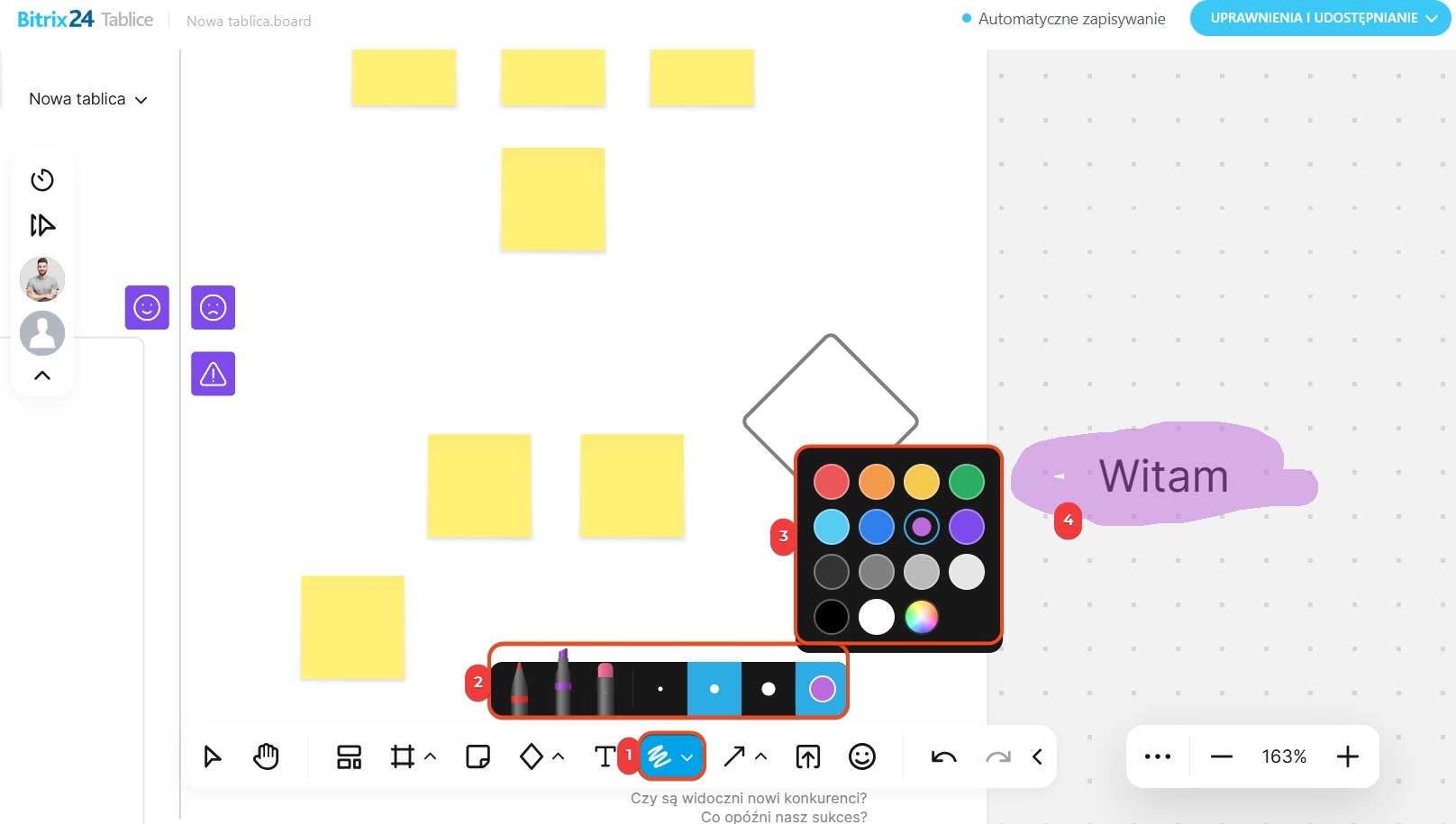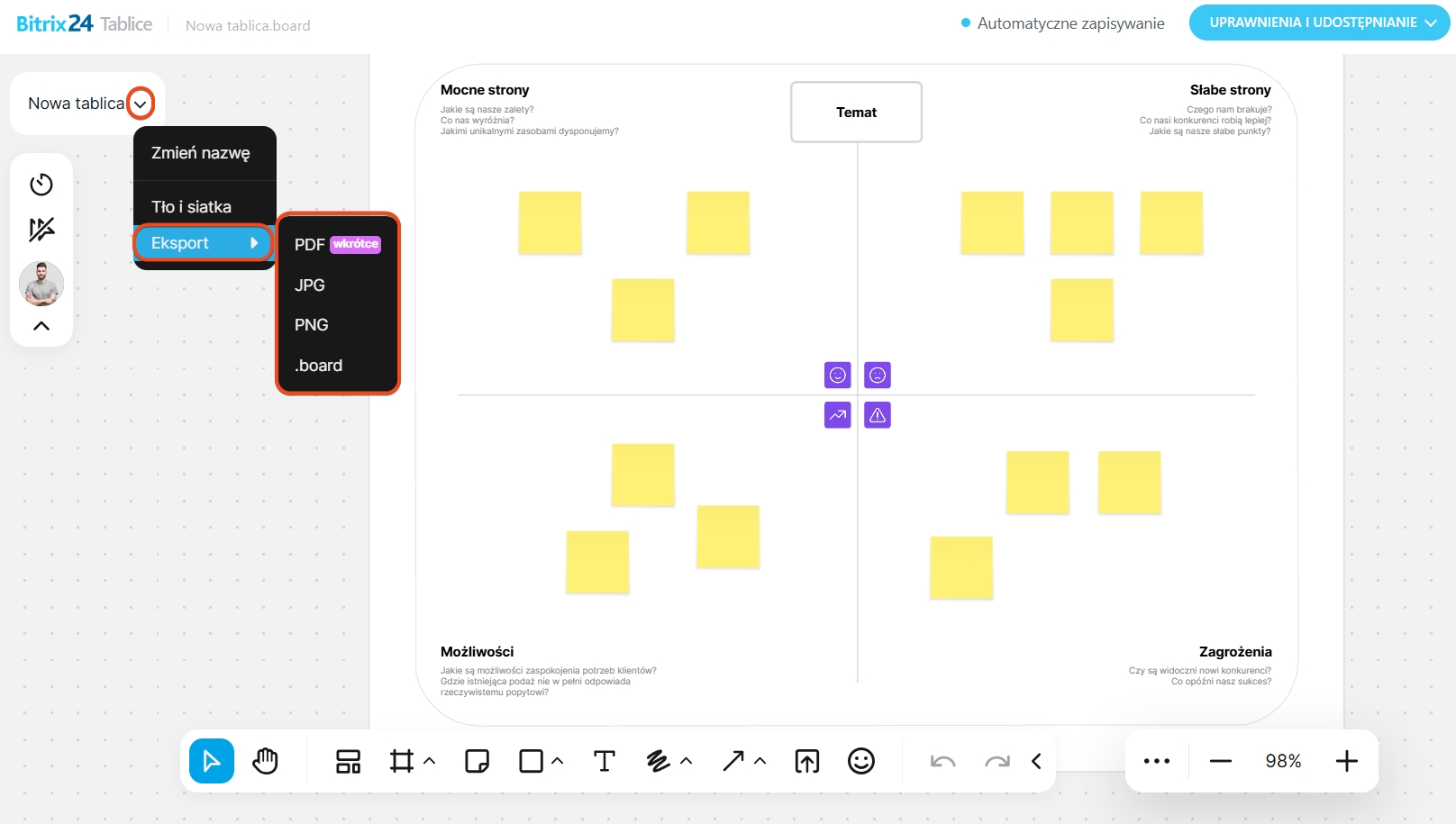 - Wszystkie zmiany zapisywane są automatycznie: uczestnicy widzą aktualizacje w czasie rzeczywistym i mogą zostawiać komentarze bezpośrednio na tablicy.