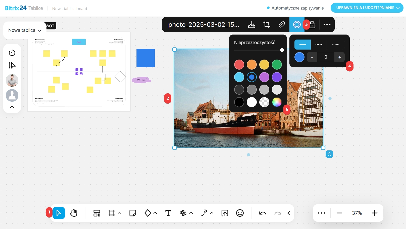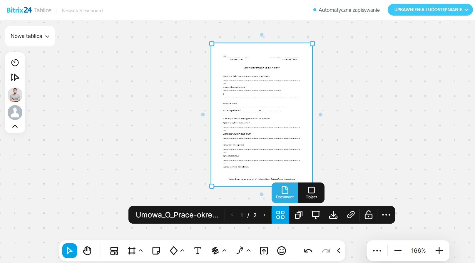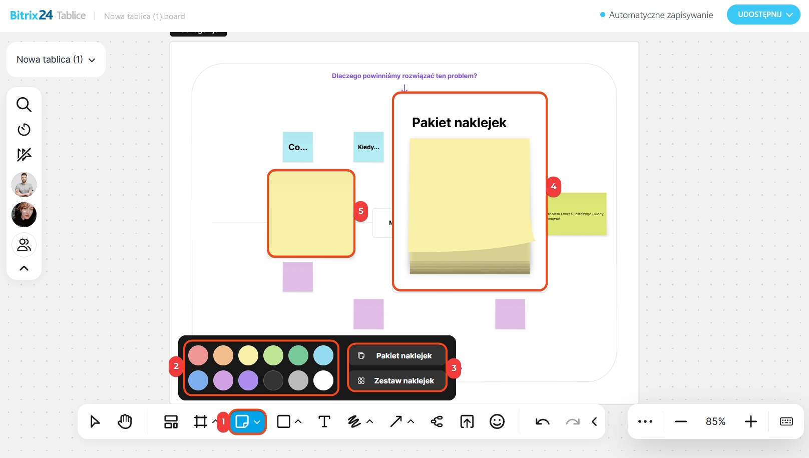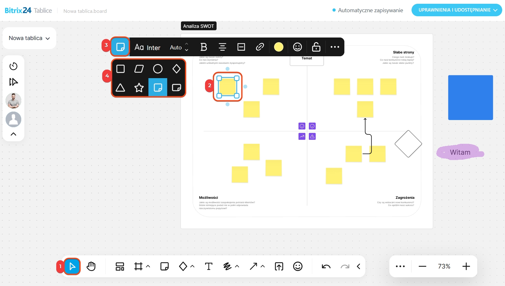 - Wszystkie zmiany zapisywane są automatycznie: uczestnicy widzą aktualizacje w czasie rzeczywistym i mogą zostawiać komentarze bezpośrednio na tablicy.