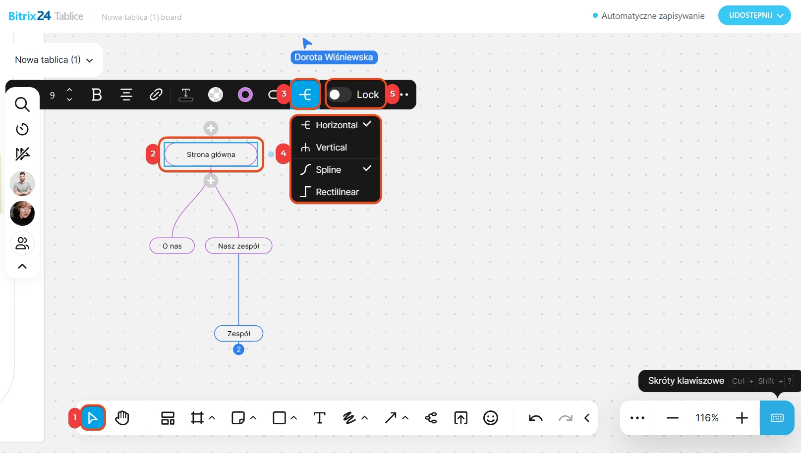 Na panelu na dole ekranu znajdują się narzędzia do pracy nad tablicą. Dzięki nim możesz tworzyć schematy blokowe, rysować, dodawać tekst, wyrównywać elementy, zaznaczać ważne szczegóły itd.