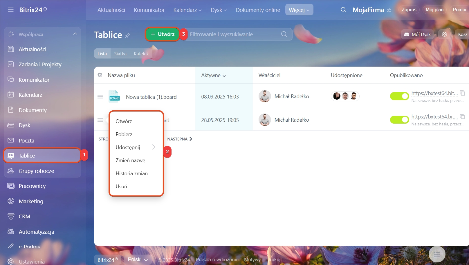 Aby współpracować nad tablicą, członkowie zespołu muszą mieć do niej dostęp. Dostęp mogą ustawić właściciel tablicy i pracownicy z pełnym dostępem – można to zrobić tylko w Bitrix24 na komputerze.