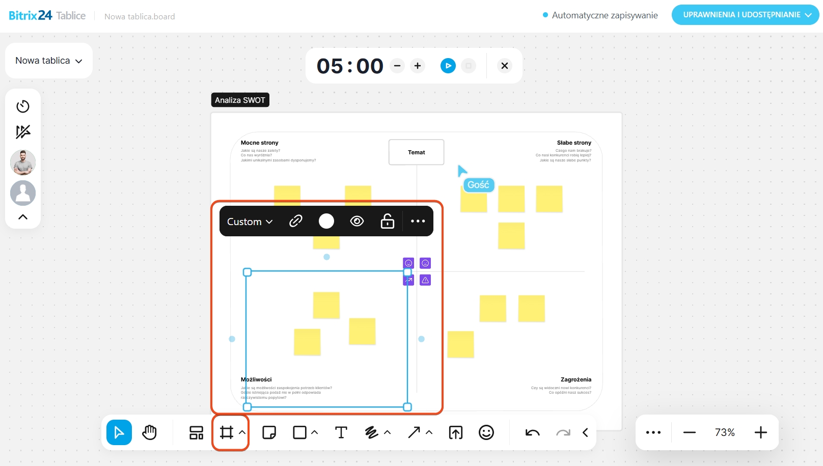 Ramka – połącz kilka obiektów w jeden blok. Wszystko, co znajduje się wewnątrz, można przesuwać i skalować razem, a elementy wyrównywać względem siebie. Dla wygody ramki można nazywać – ułatwia to orientację na tablicy.