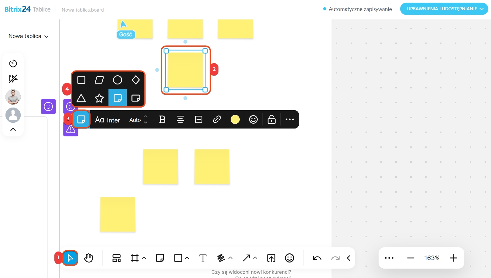 Notatka – nadaje się do przekazywania informacji zwrotnej bezpośrednio na tablicy. Przyczep notatkę obok elementu, który chcesz omówić, i napisz komentarz – inni członkowie zespołu zobaczą notatkę na jasnym tle i będą mogli ją uwzględnić.