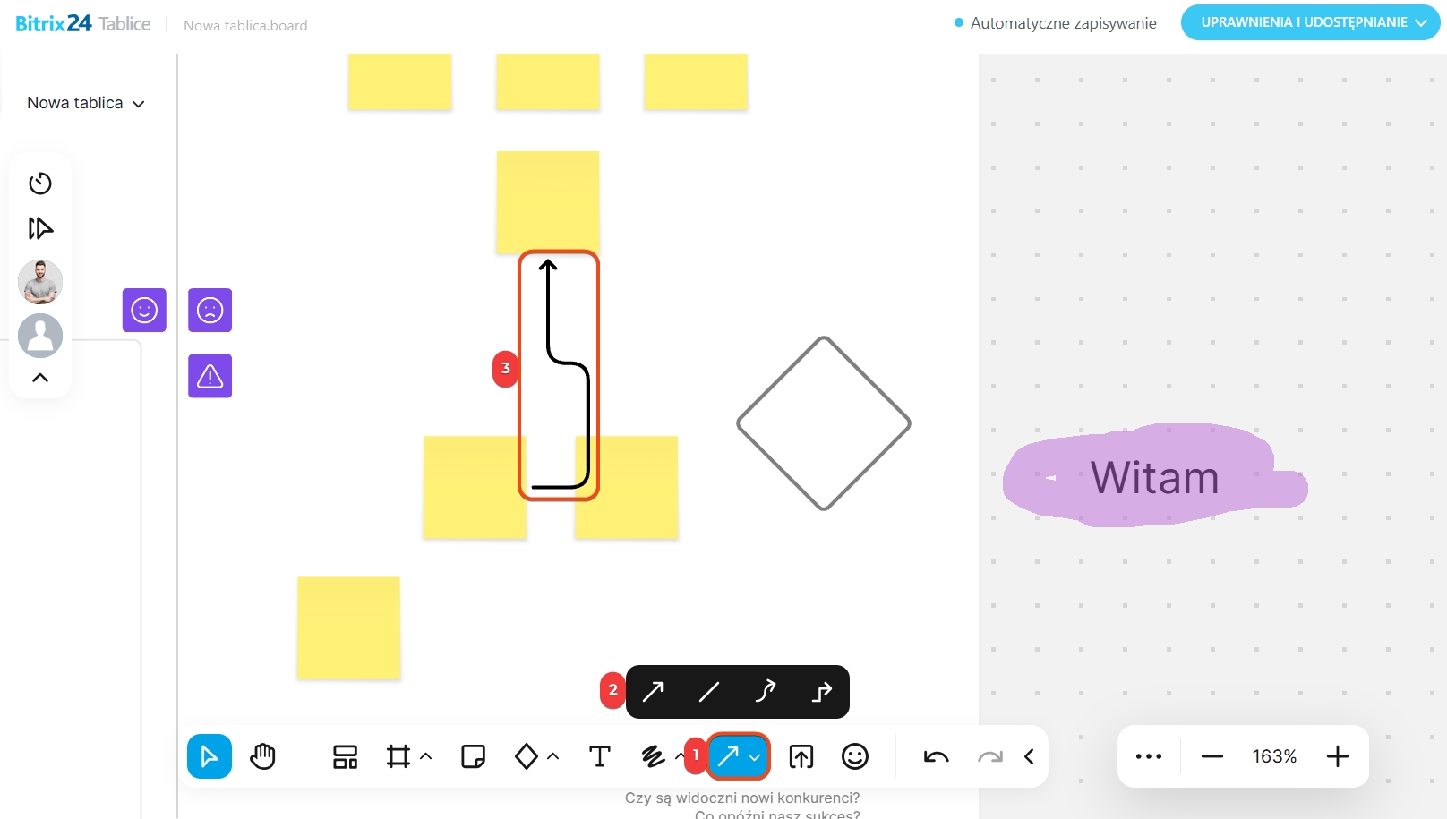 Strzałka – połącz obiekty na tablicy. Możesz używać różnych typów strzałek, aby pokazać powiązania między elementami lub zwizualizować kolejność kroków.