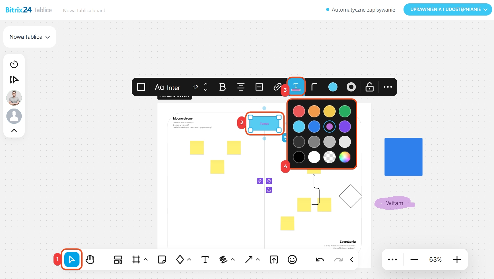 Tekst – dodaj na tablicę blok tekstowy: podpis, komentarz, nagłówek. Użyj, jeśli chcesz opisać pomysł, zostawić uwagę do projektu, ponumerować kroki na zrzucie ekranu itd.