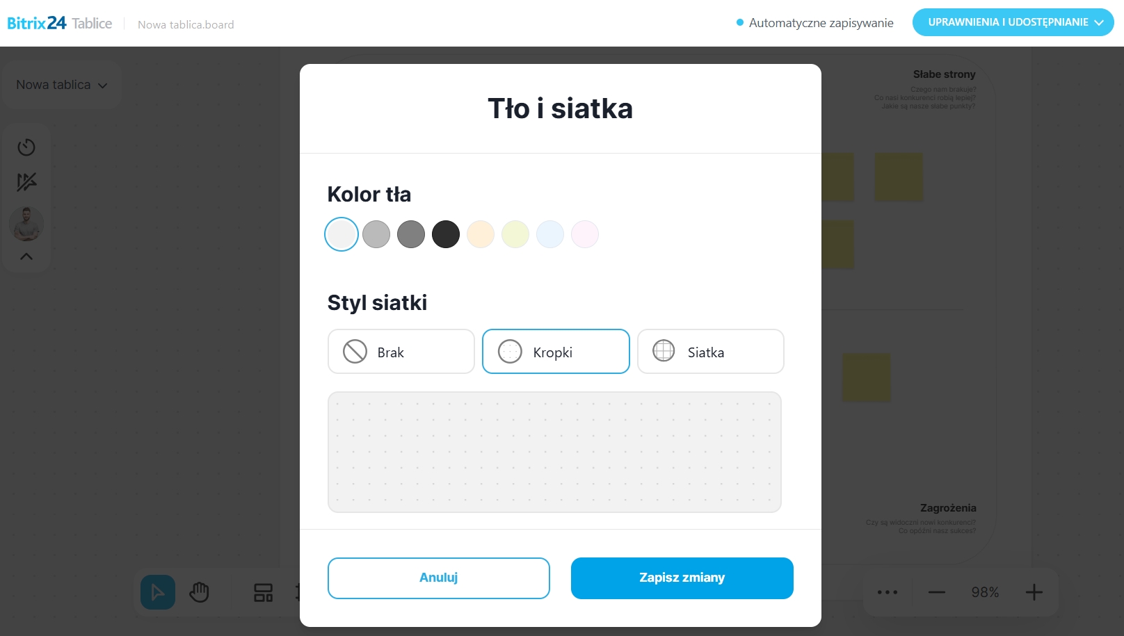 - Tło i siatka – dostosuj wygląd tablicy. Wybierz kolor tła i typ siatki: kropki, kratka lub usuń oznaczenia.