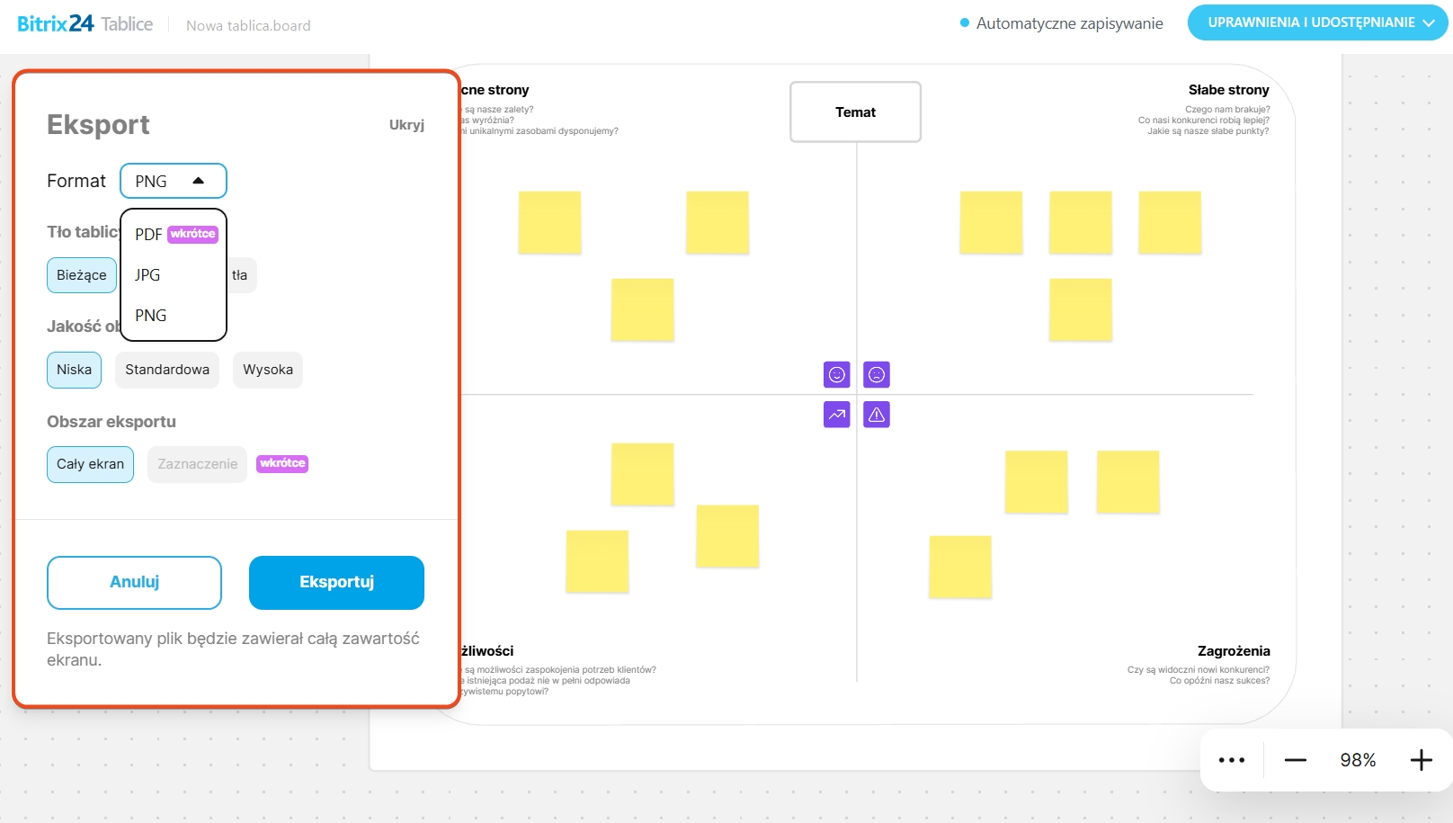 - Eksportuj – pobierz tablicę na komputer. Wybierz tło i obszar tablicy do eksportu, format i rozdzielczość pliku.