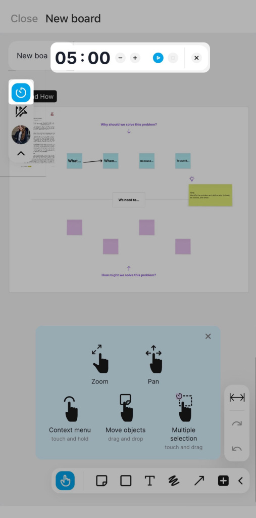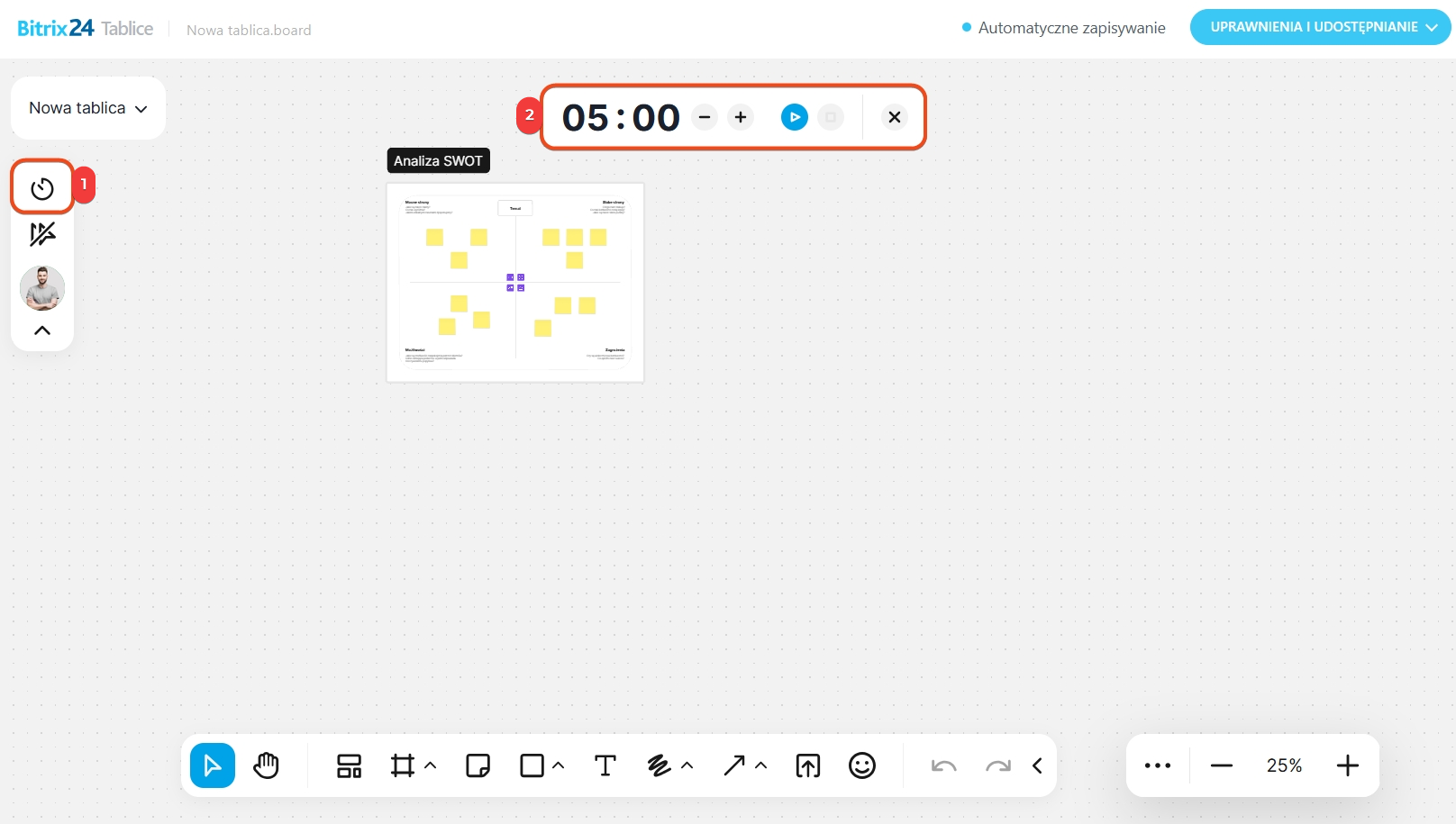 Timer – pomaga zespołowi przestrzegać harmonogramu i skupić się na zawartości tablicy. Na przykład podczas prezentacji projektu lub omawiania pomysłów. Uruchomiony timer jest widoczny dla wszystkich, którzy w danym momencie pracują nad tablicą.