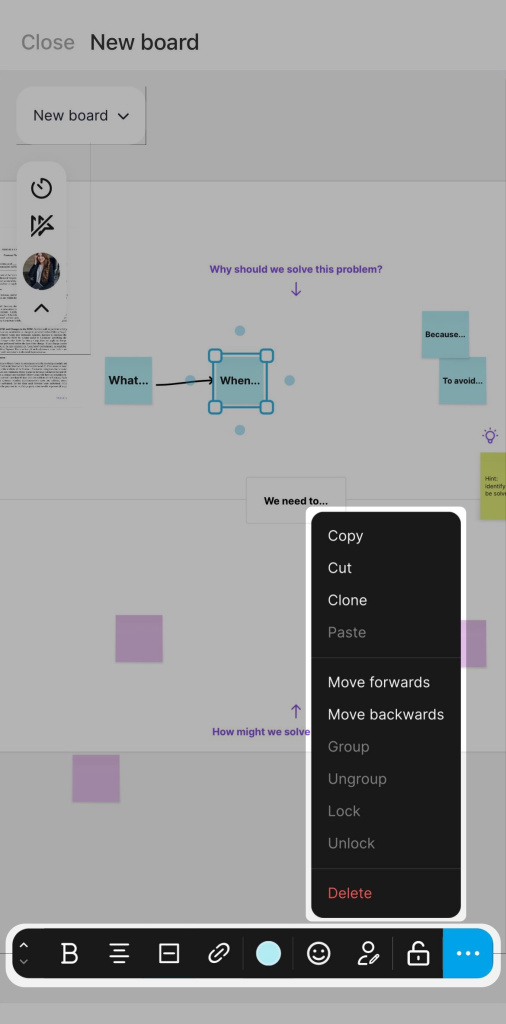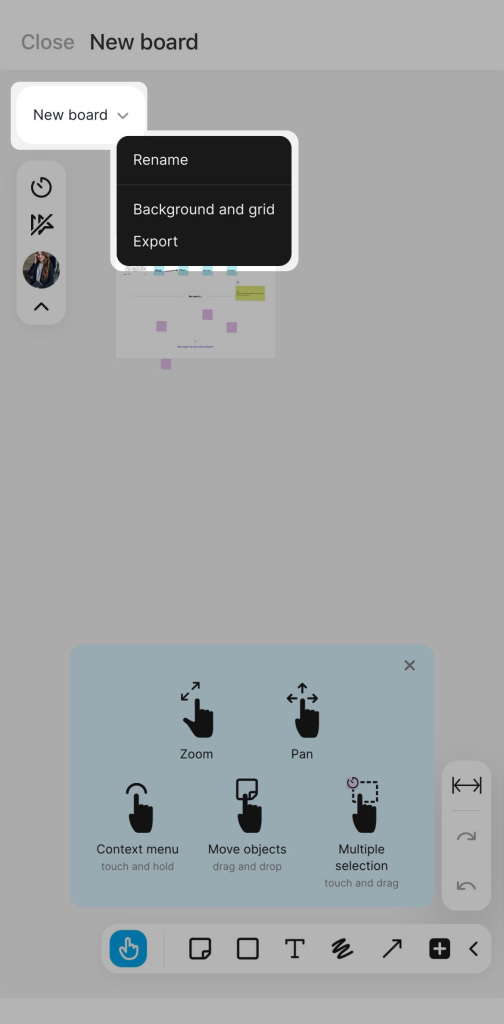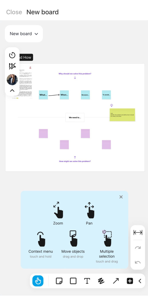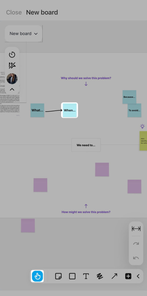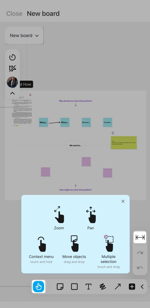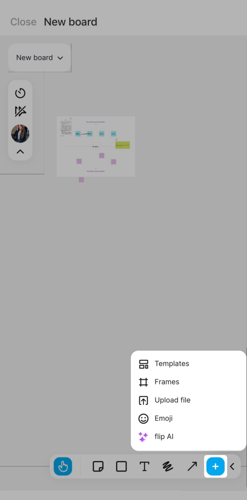 W aplikacji mobilnej możesz pracować nad tablicą tak samo, jak na komputerze: tworzyć schematy blokowe, dodawać napisy, emoji i notatki itd. Panel narzędzi znajduje się na dole ekranu – kliknij ➕, aby go rozwinąć.