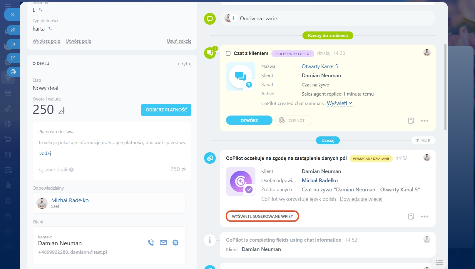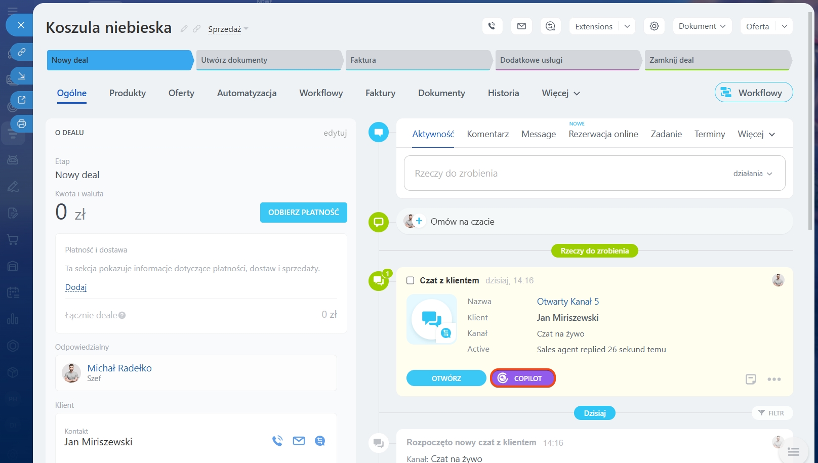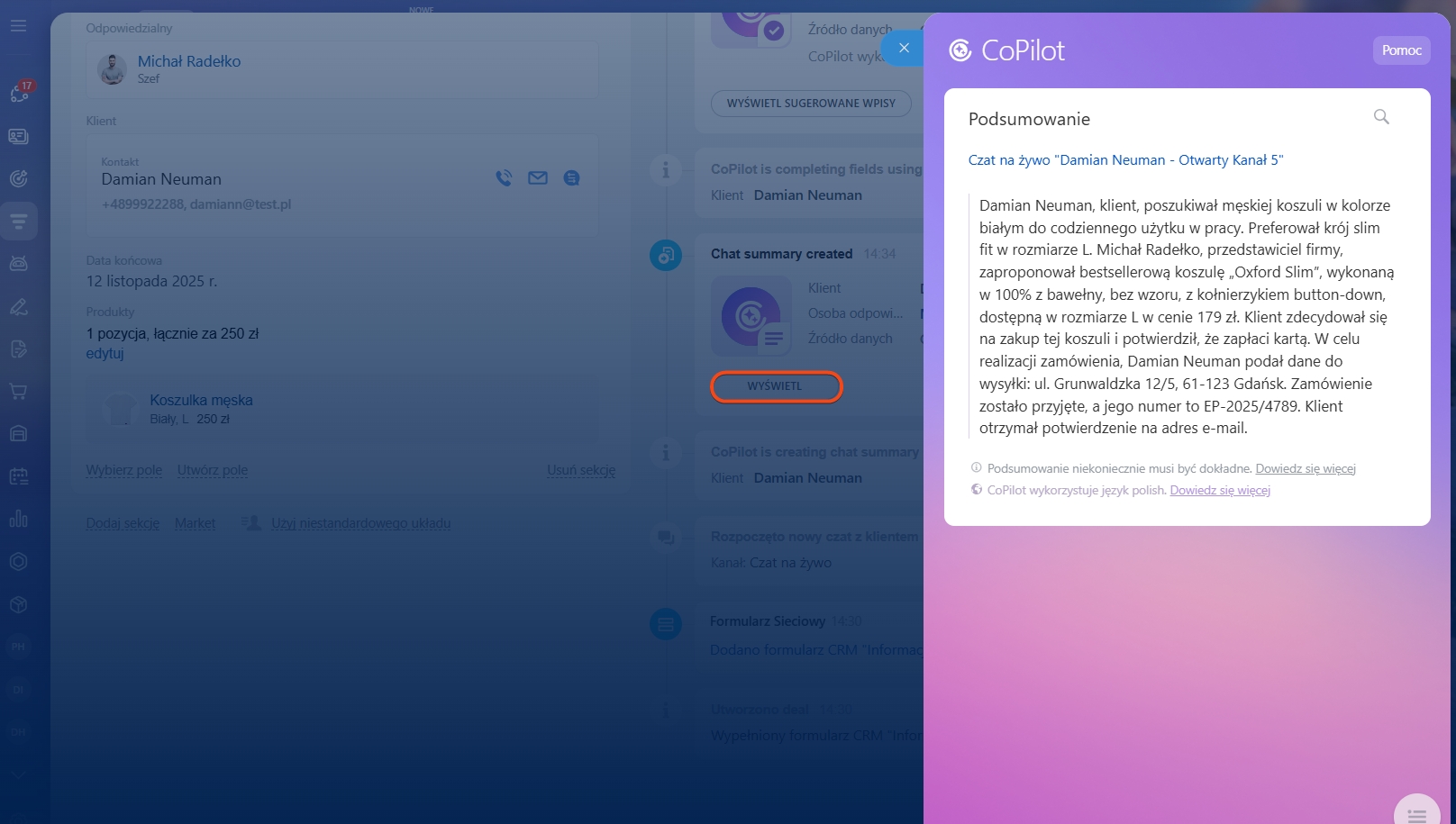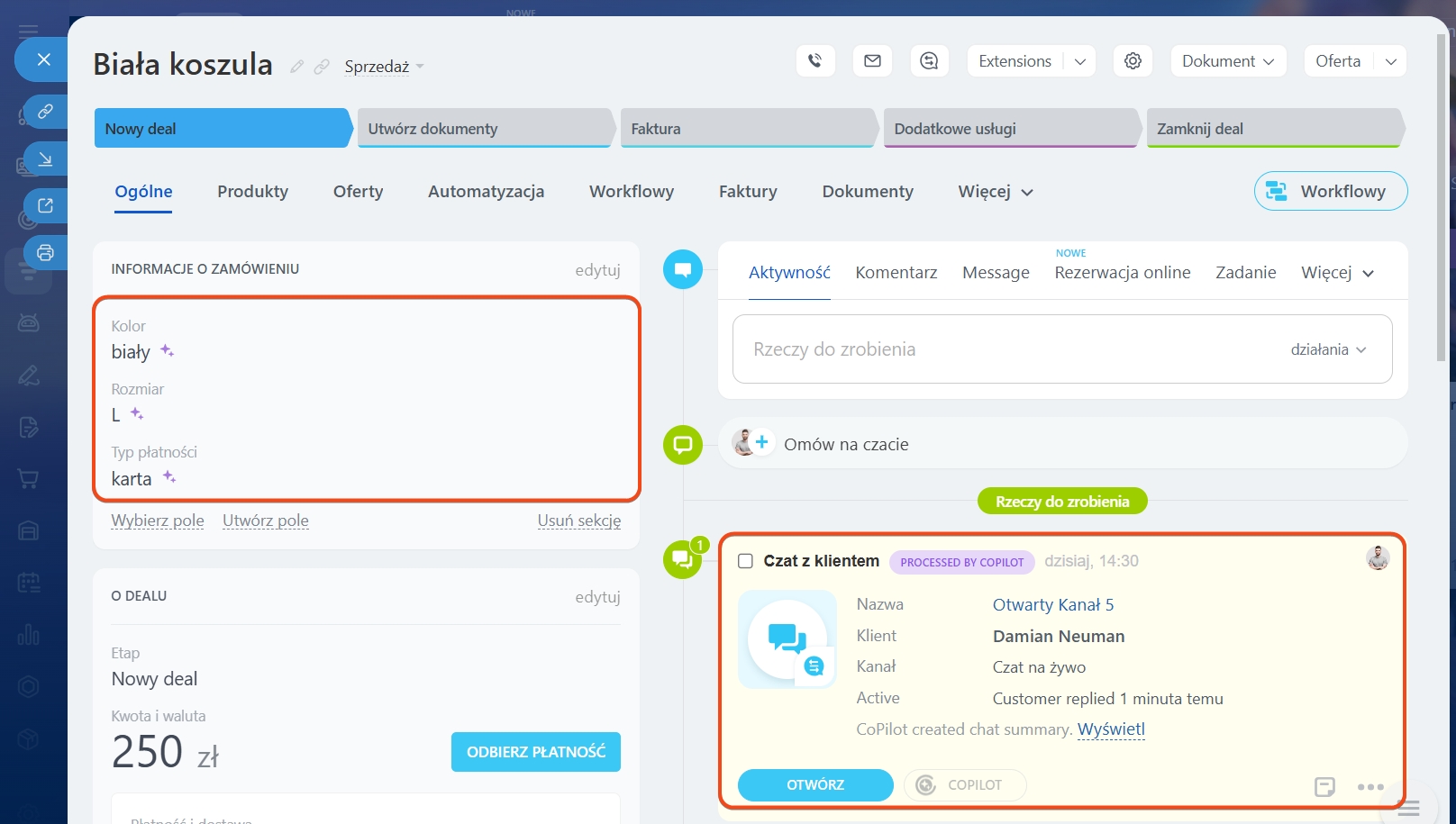 Analiza czatów z klientami za pomocą CoPilot jest dostępna zarówno w leadach, jak i w dealach.