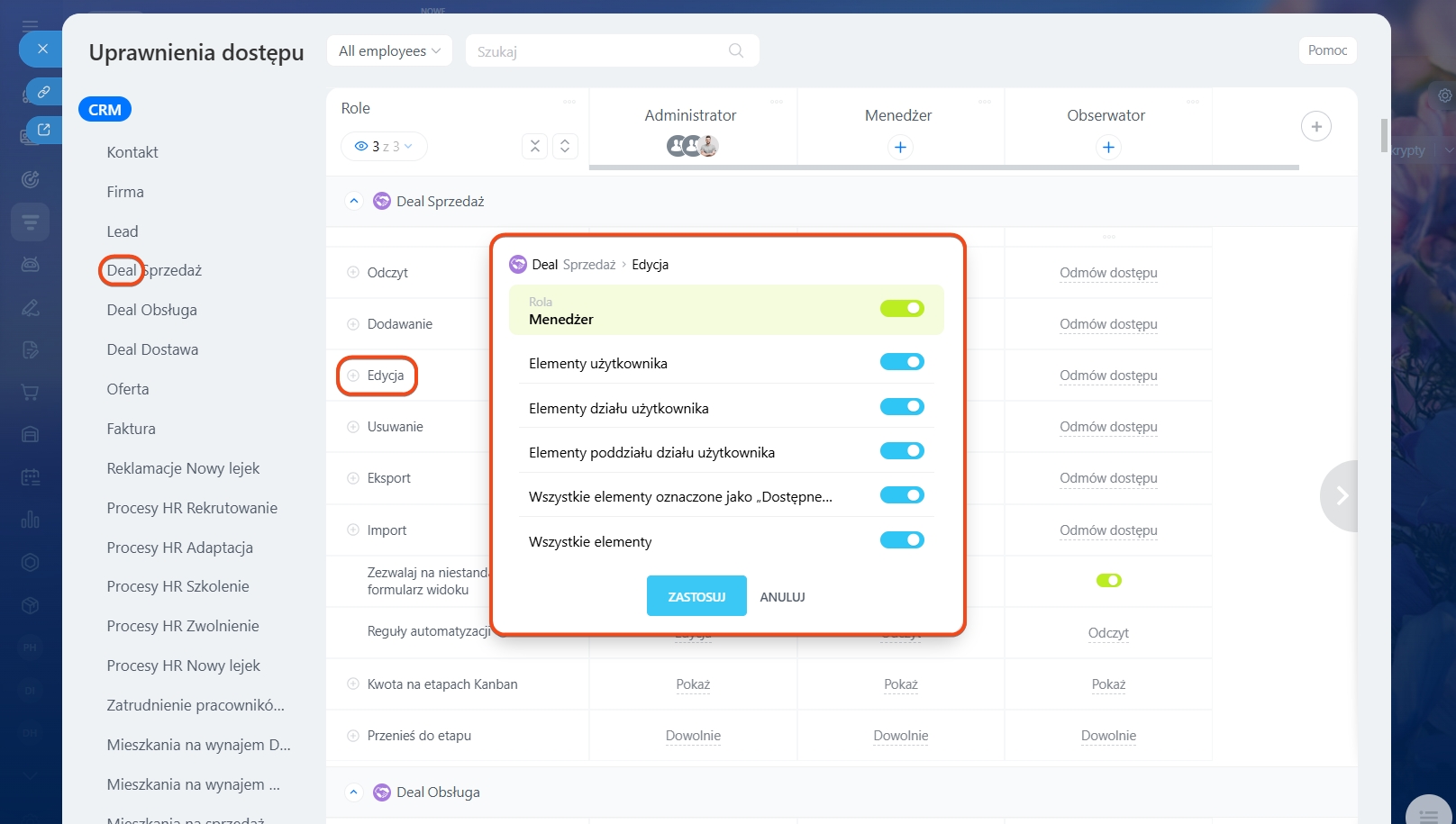 2. Przyznaj pracownikowi uprawnienia do edycji odpowiedniego elementu CRM. Na przykład, aby przetworzyć czat w dealu, wymagane są uprawnienia do edycji deali.