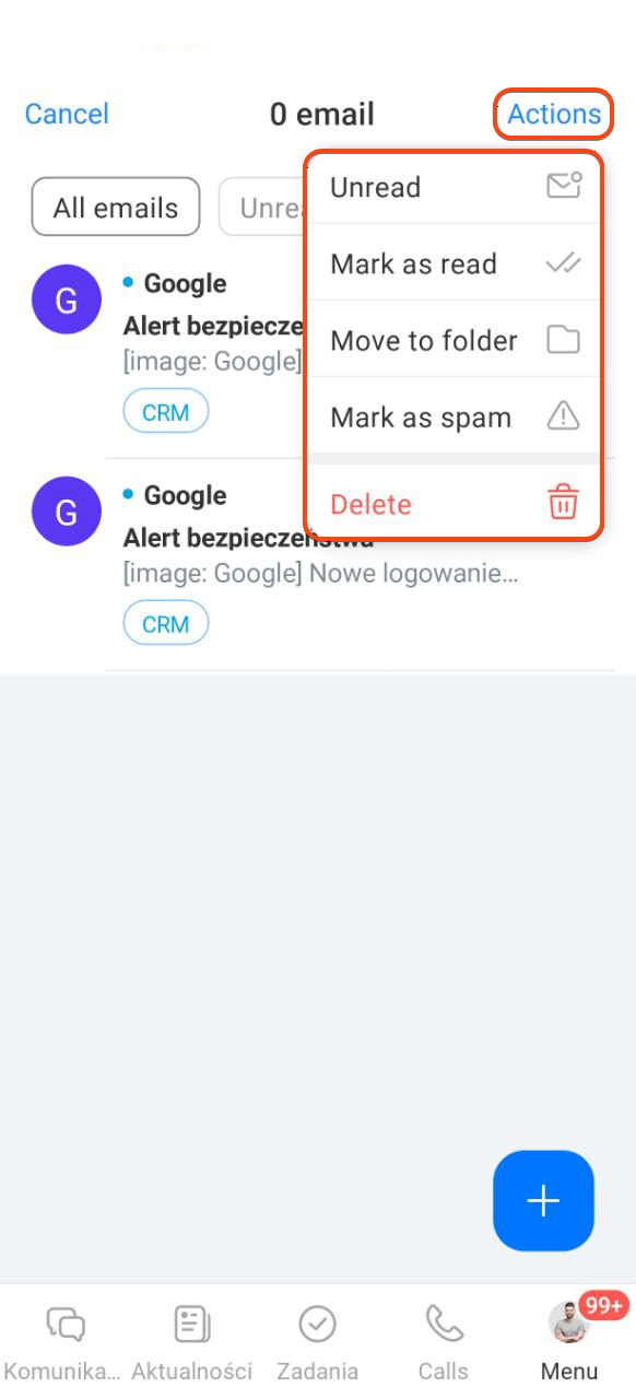 Po podłączeniu poczty w aplikacji mobilnej Bitrix24 możesz wykonywać wszystkie podstawowe działania z e-mailami.