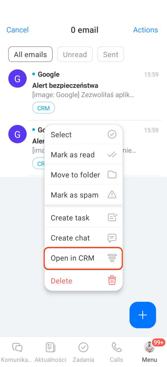 Kliknij i przytrzymaj wybraną wiadomość, wybierz działanie — na przykład dodaj do CRM. Obok takiej wiadomości pojawi się napis CRM, a Ty będziesz mógł szybko przejść do powiązanego formularza.