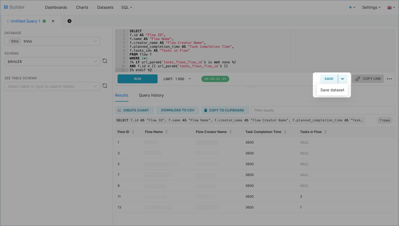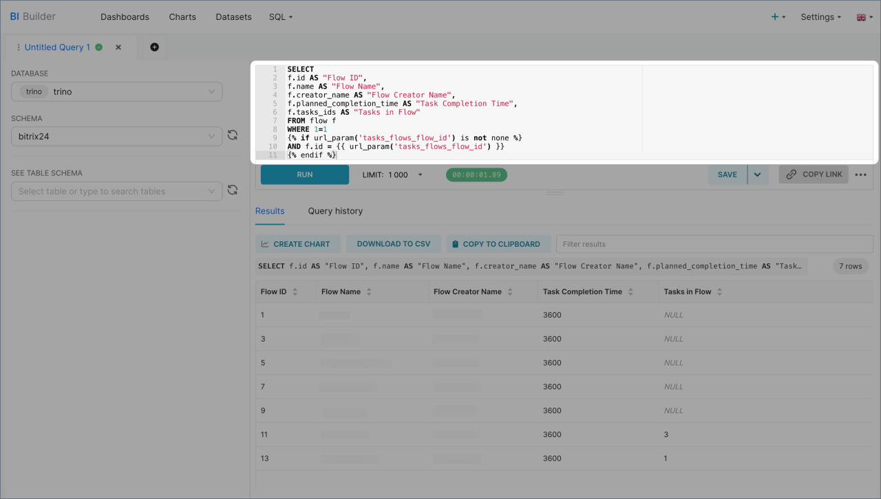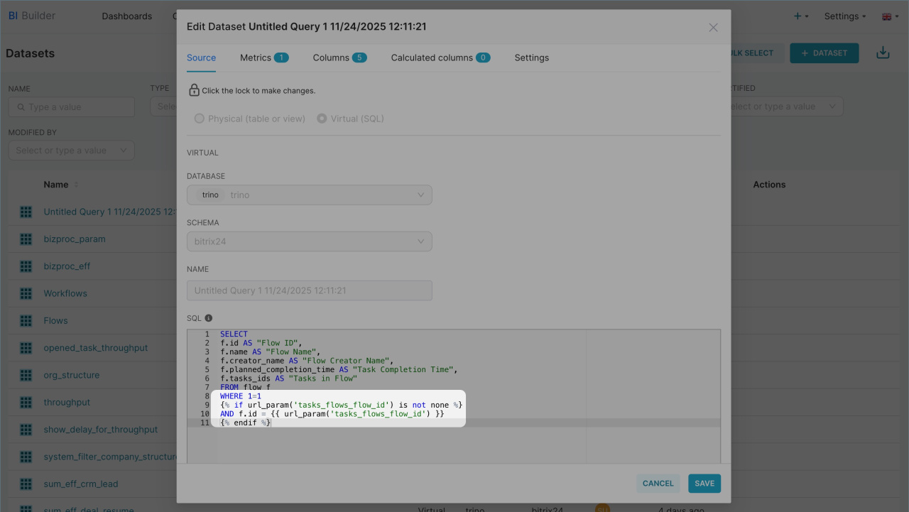 Następnie używany jest szablon Jinja. Ta część sprawdza, czy parametr tasks_flows_flow_id jest obecny w raporcie. Jeśli raport jest otwierany z przepływu, Jinja zastępuje jego identyfikator i wyświetla dane tylko dla tego przepływu. Jeśli raport jest otwierany bezpośrednio w BI Builder, parametr nie jest przekazywany i wyświetlane są wszystkie dane.