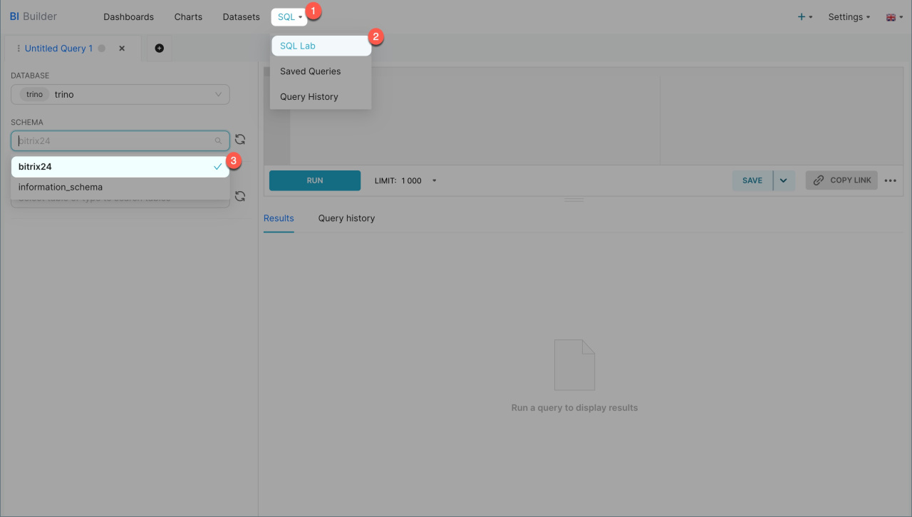 - Wprowadź zapytanie SQL i kliknij Run. Dodaj szablon Jinja do zapytania, aby upewnić się, że raport poprawnie stosuje wartość filtra. Na przykład, jeśli raport jest otwierany z protokołu workflow, Jinja zastąpi jego identyfikator, a raport wyświetli dane tylko dla tego procesu. Jeśli raport jest otwierany osobno, filtr nie otrzyma identyfikatora i wyświetli wszystkie dane.