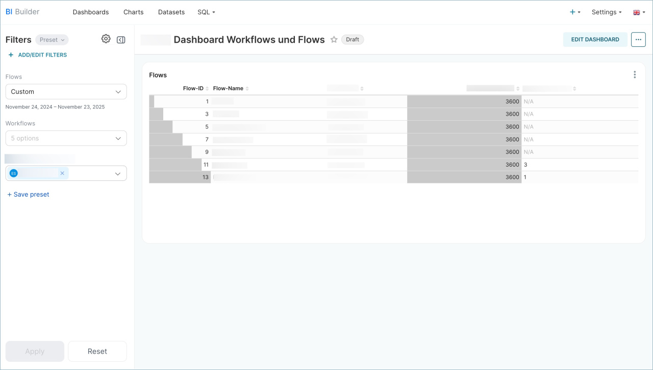 W Kreatorze BI możesz używać filtrów opartych na parametrach, takich jak przepływy zadań i szablony workflow. Filtry te pomagają analizować dane w odpowiednim kontekście, na przykład koncentrując się na konkretnym przepływie lub indywidualnym szablonie workflow.