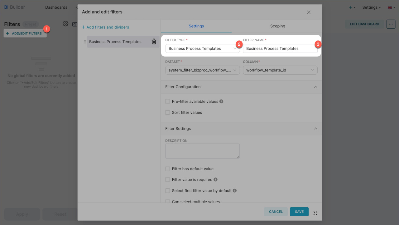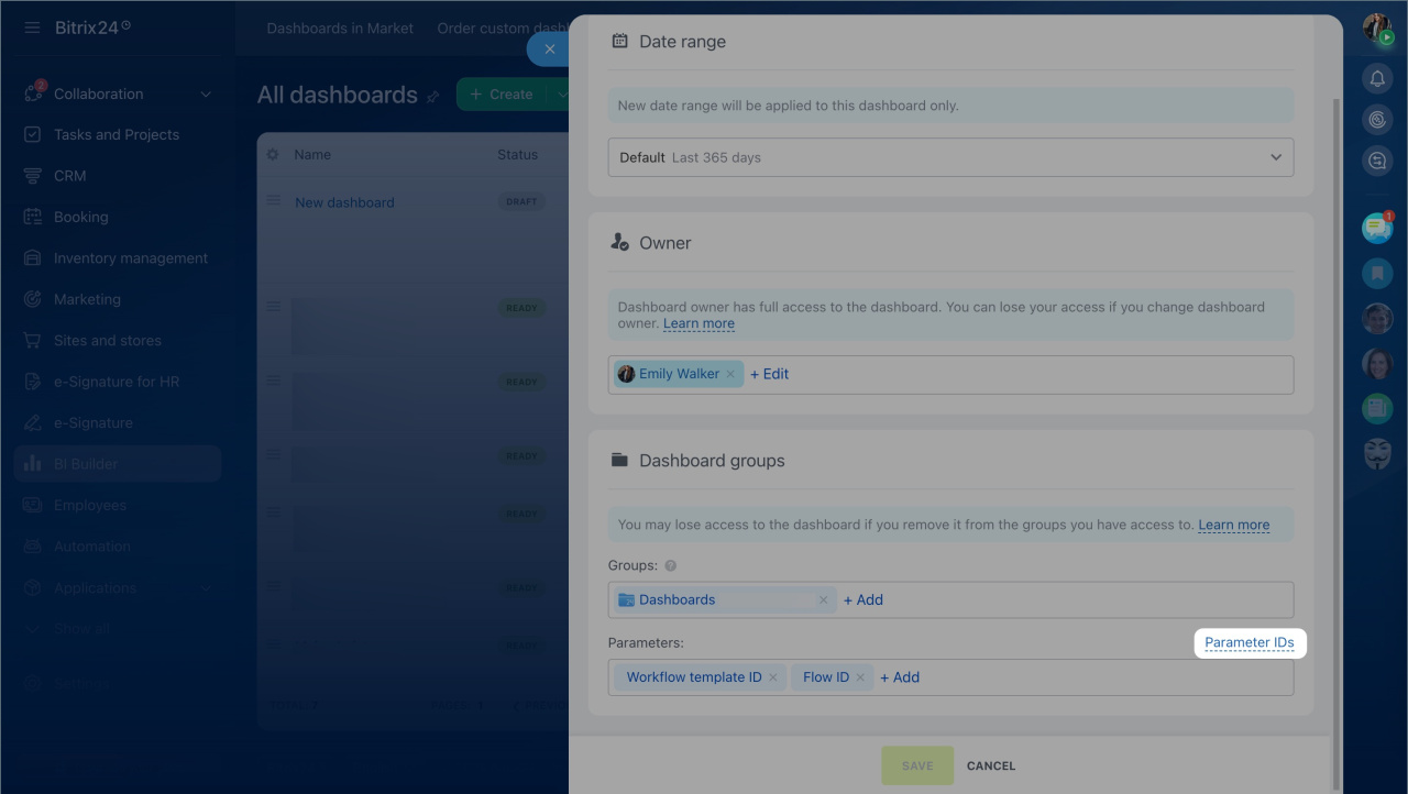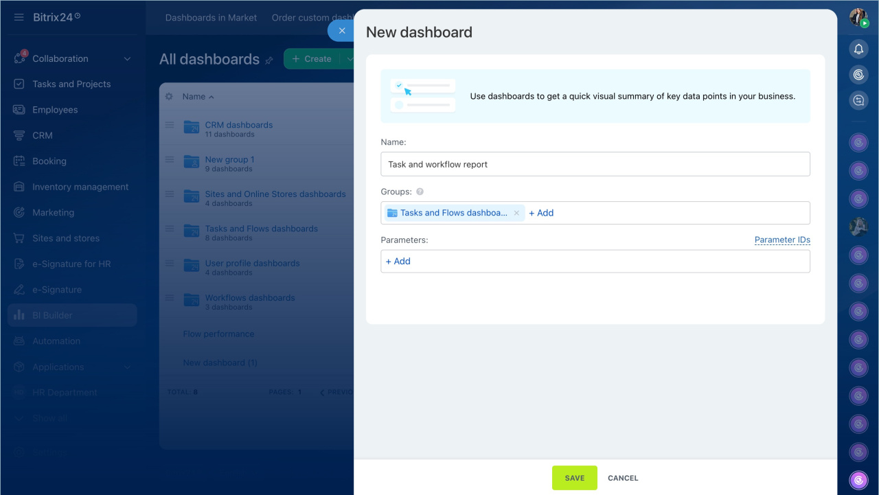 Przed dodaniem filtrów musisz skonfigurować parametry. Parametry te tworzą połączenie między raportem a danymi. Na przykład parametr tasks_flows_flow_id przekazuje identyfikator przepływu zadań, a bworkflow_template_id przekazuje identyfikator szablonu workflow. Parametry te można ustawić zarówno dla nowych, jak i istniejących raportów: