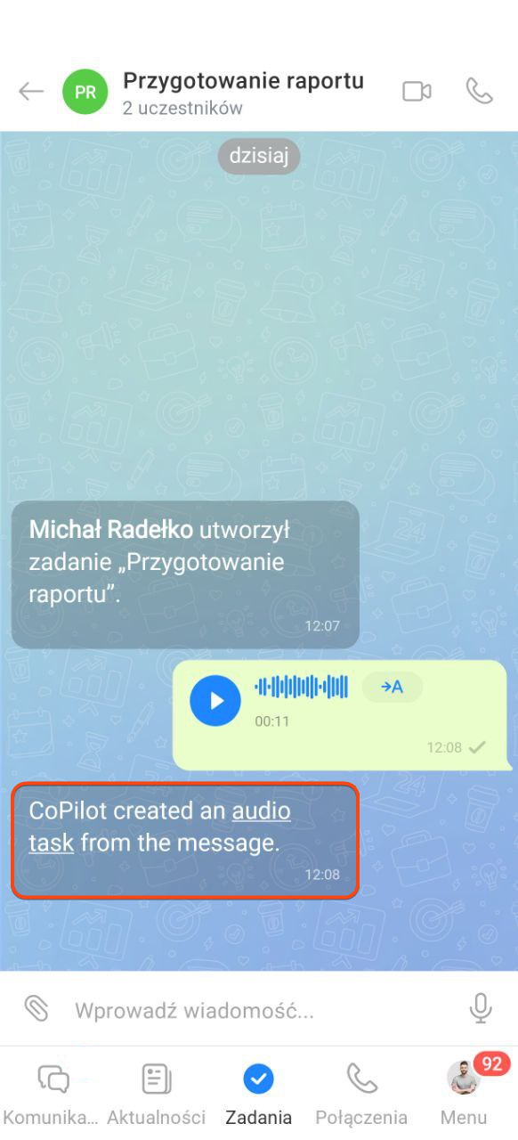 3. Puść przycisk, aby wysłać wiadomość. AI rozpozna, że to polecenie i automatycznie utworzy zadanie.