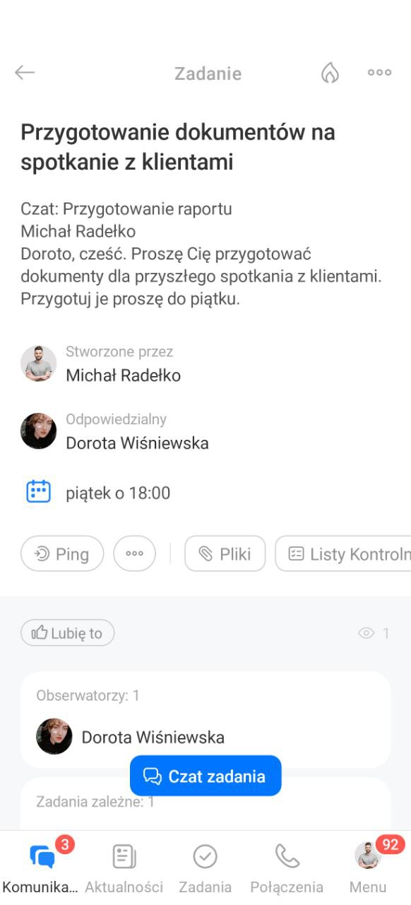 - Po utworzeniu zadania w czacie pojawia się powiadomienie. Możesz otworzyć zadanie i dodać uczestników, pliki i inne ustawienia.