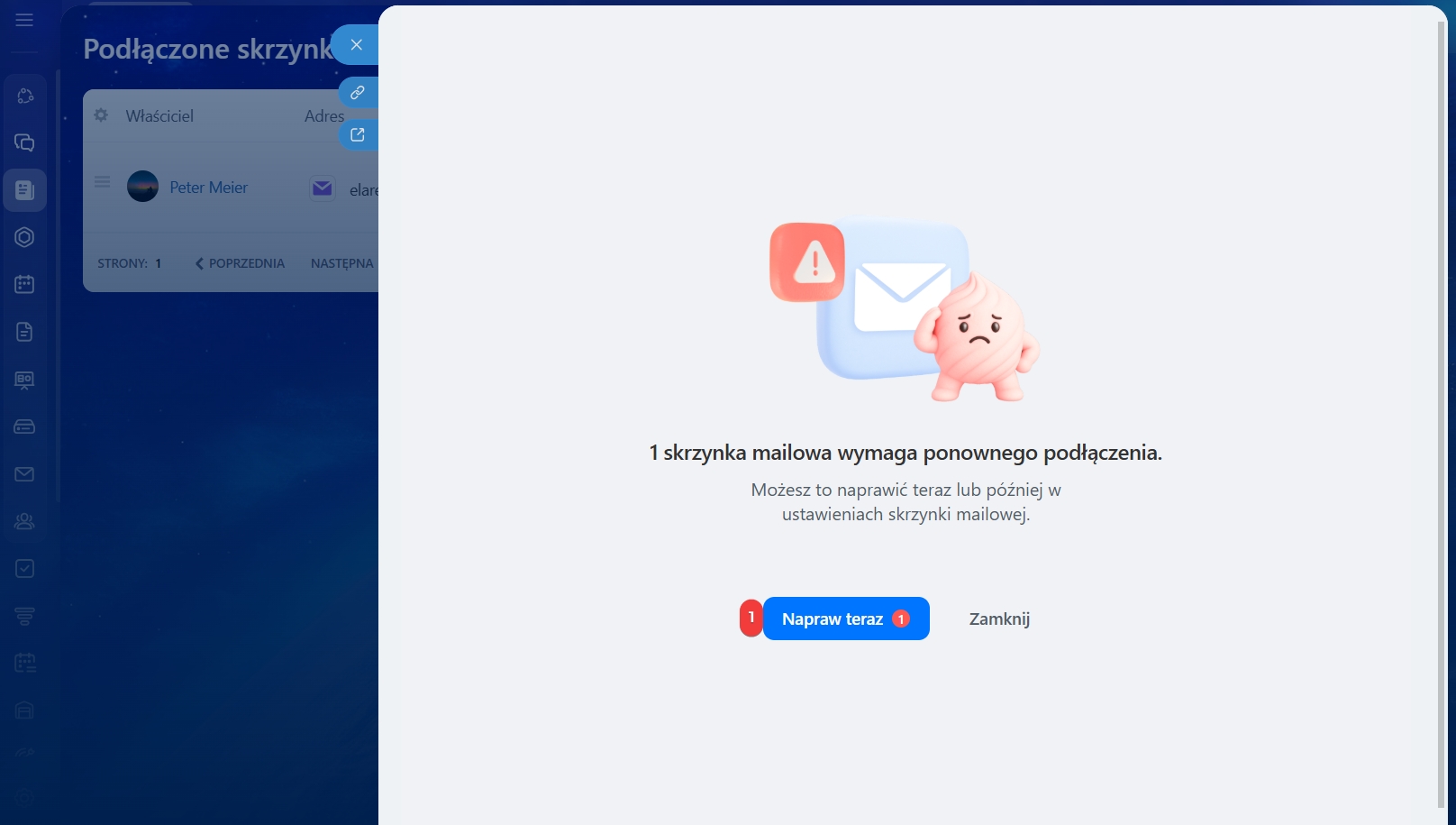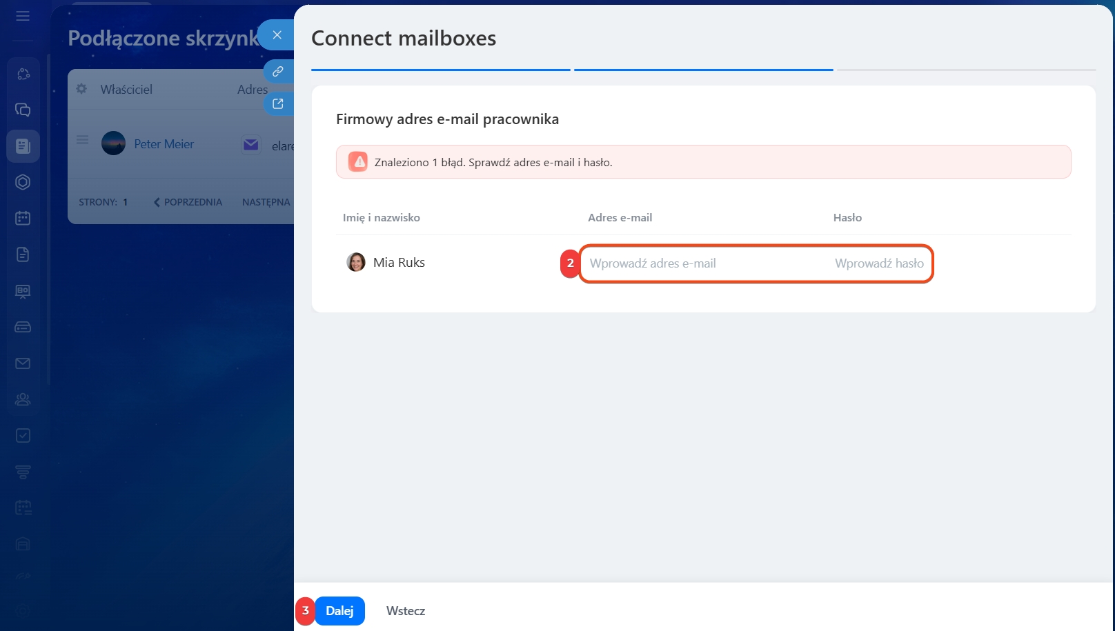 Jeśli podczas podłączania wystąpiły błędy, Bitrix24 wskaże, którym pracownikom nie udało się podłączyć poczty. Będziesz mógł szybko poprawić dane i ponowić podłączenie — bez konieczności ponownej konfiguracji całej listy skrzynek.