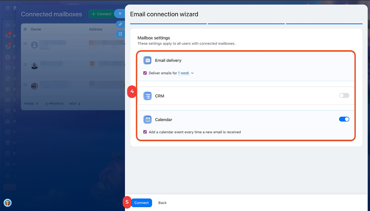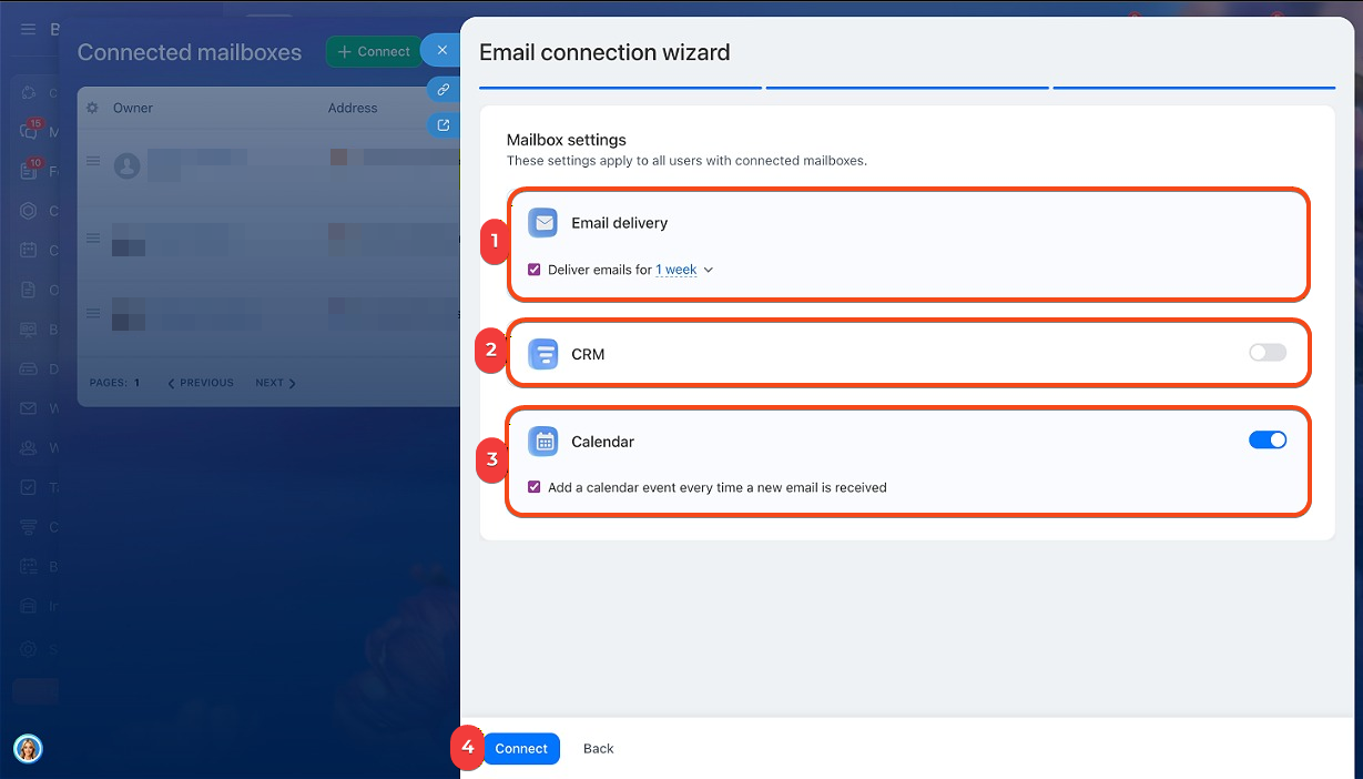 - Przed podłączeniem skrzynek należy je skonfigurować: wybrać, za jaki okres załadować wiadomości do Bitrix24, włączyć integrację z CRM i skonfigurować integrację z kalendarzem.