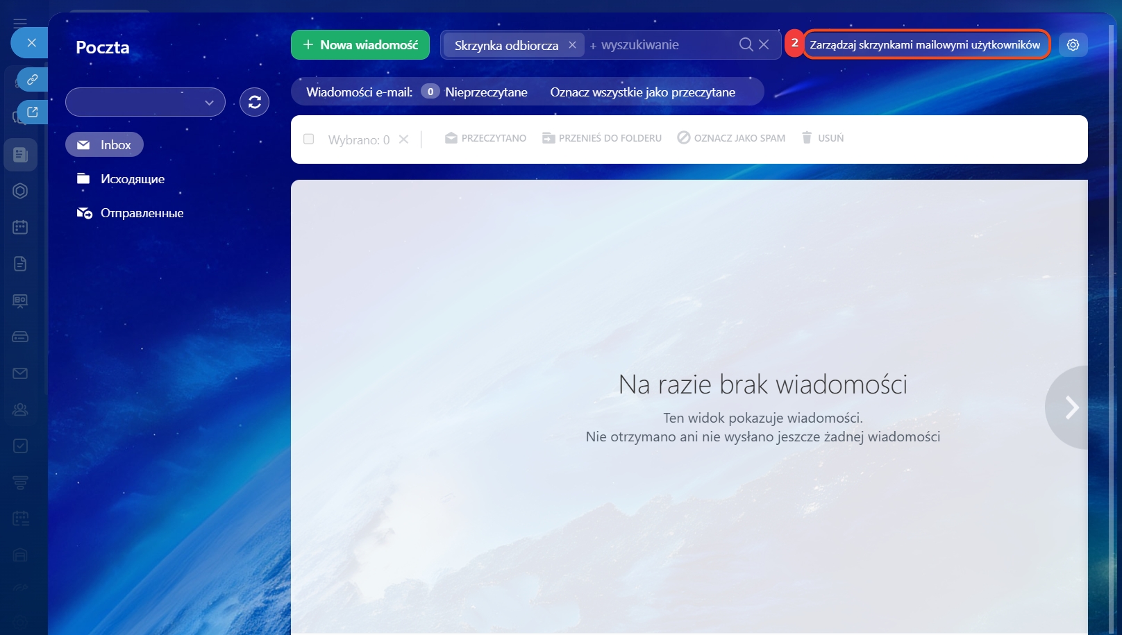 - Aby podłączyć skrzynki, przejdź do sekcji Poczta > Zarządzanie skrzynkami pocztowymi. Jeśli poczta nie jest jeszcze podłączona, wybierz opcję Masowe podłączenie.
