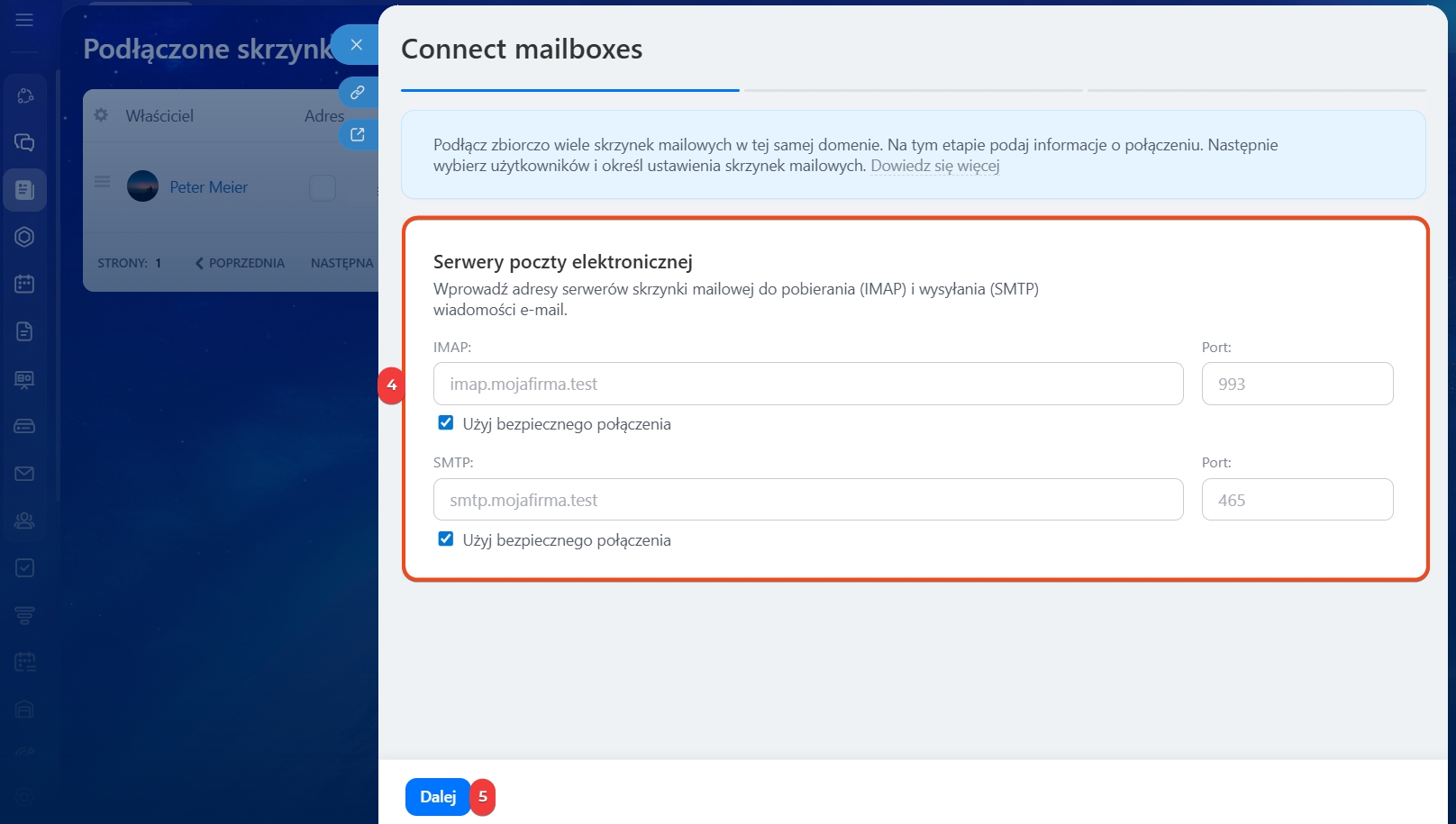 Jeśli skrzynki mają jedną domenę pocztową i te same parametry SMTP oraz IMAP, możesz podłączyć pocztę firmową jednocześnie dla grupy pracowników — na przykład działu sprzedaży lub obsługi klienta.