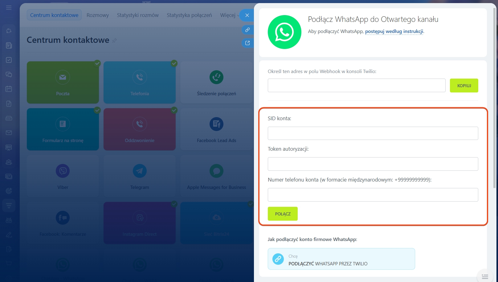 - Następnie podaj Account SID, Auth Token i Numer telefonu konta w odpowiednich polach ustawień połączenia WhatsApp w Bitrix24. Kliknij Połącz.
