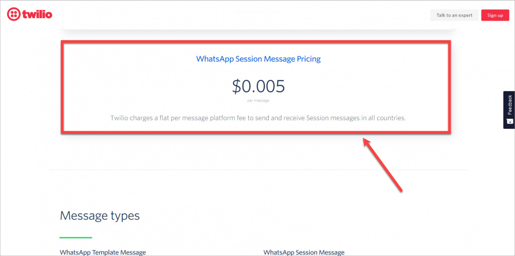 Twilio pobiera opłaty za WhatsApp Session Message (zwykle $0.005 za każdą wiadomość). Więcej informacji znajdziesz na stronie WhatsApp Business API pricing page.