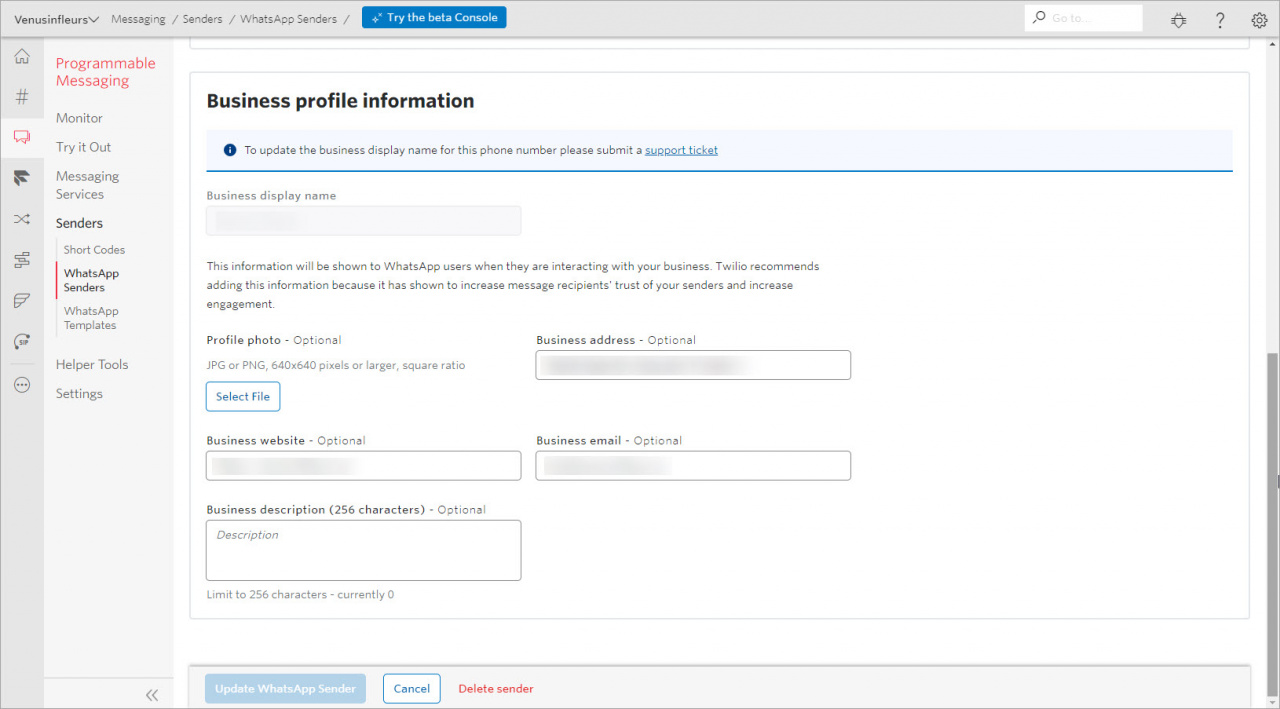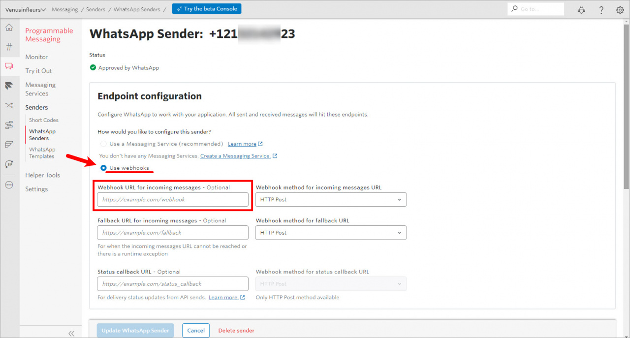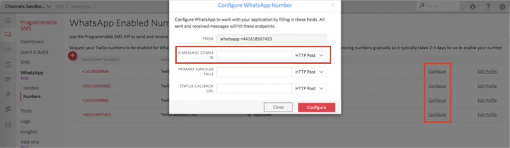 - Skopiuj adres podany w ustawieniach połączenia WhatsApp w Bitrix24. Przejdź do sekcji WhatsApp > WhatsApp Enabled Senders w konsoli Twilio > wybierz swój numer > kliknij Configure > wklej adres w pole A Message Comes In.
