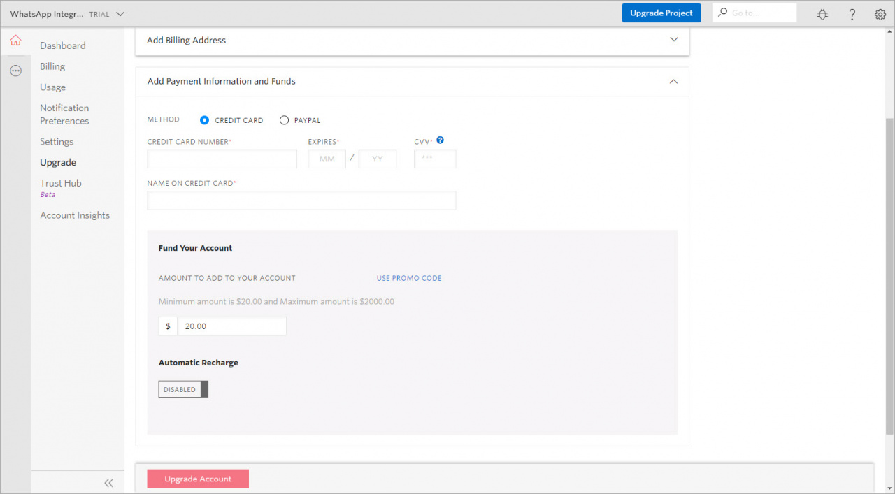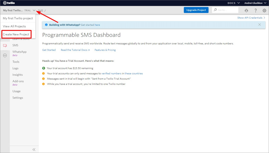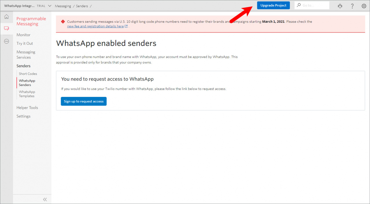 Jeśli masz konto testowe, musisz przejść na płatne konto, aby połączyć integrację WhatsApp. W tym celu kliknij przycisk Upgrade Project.