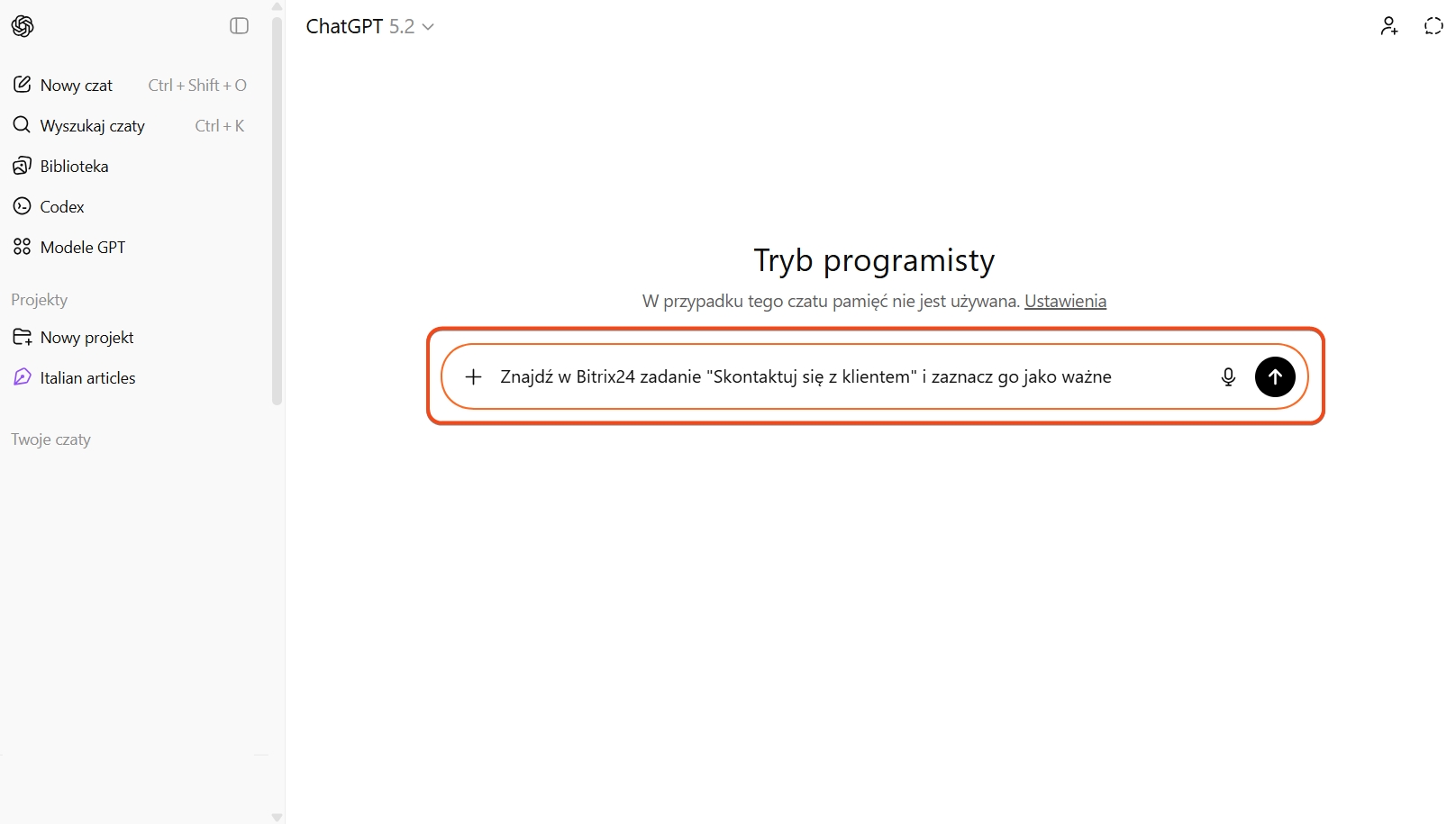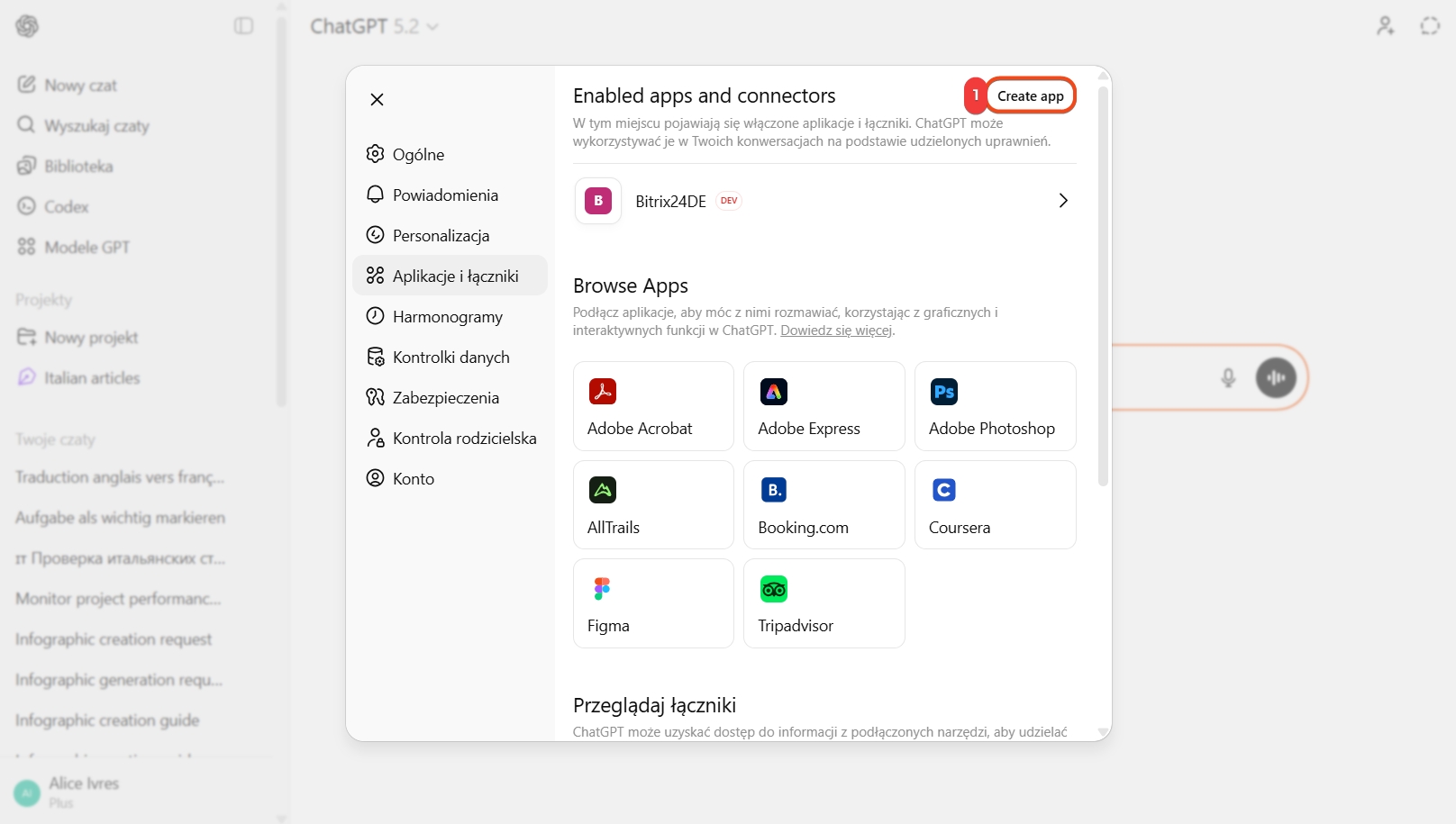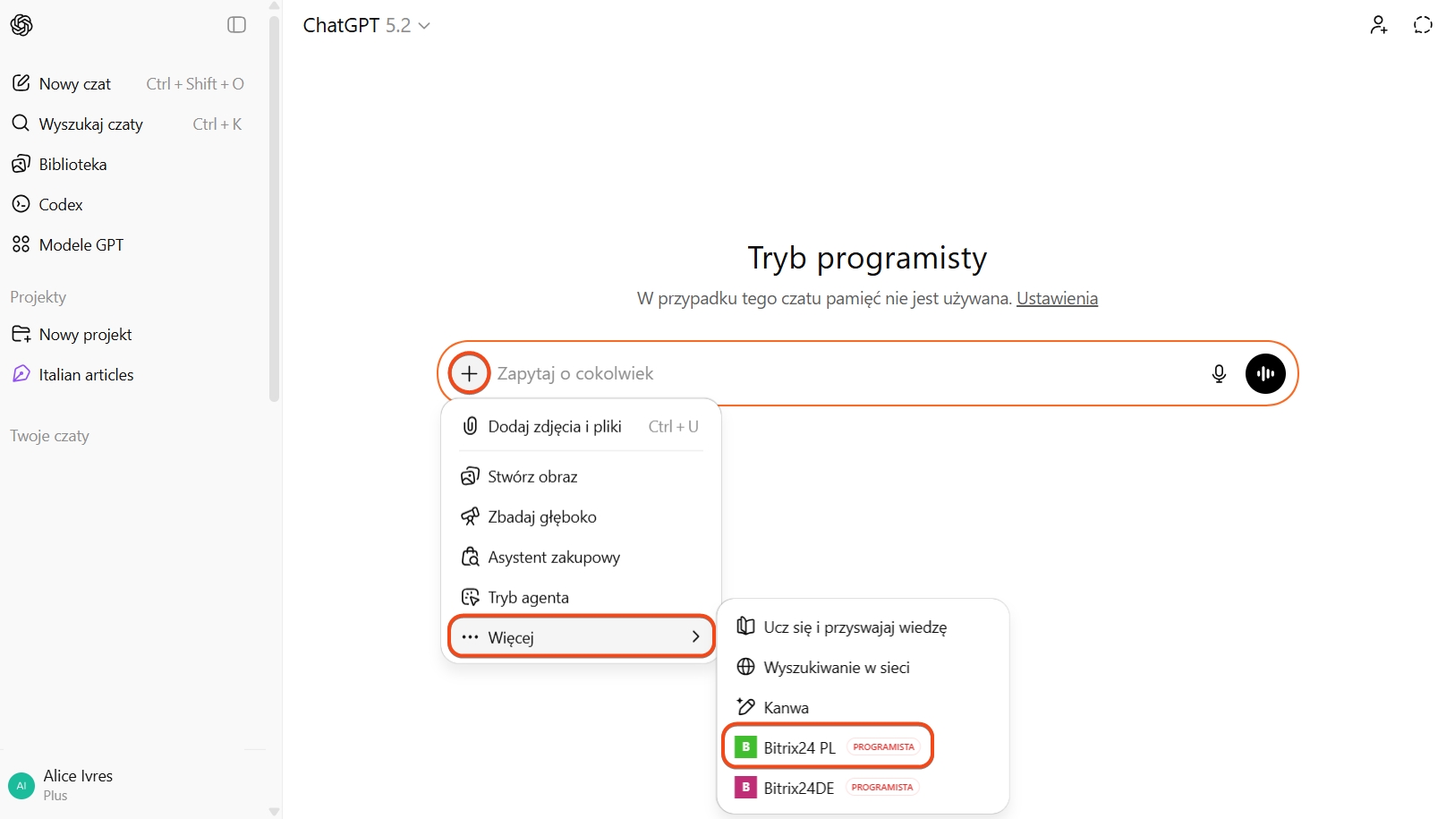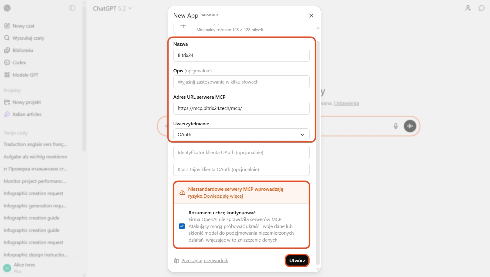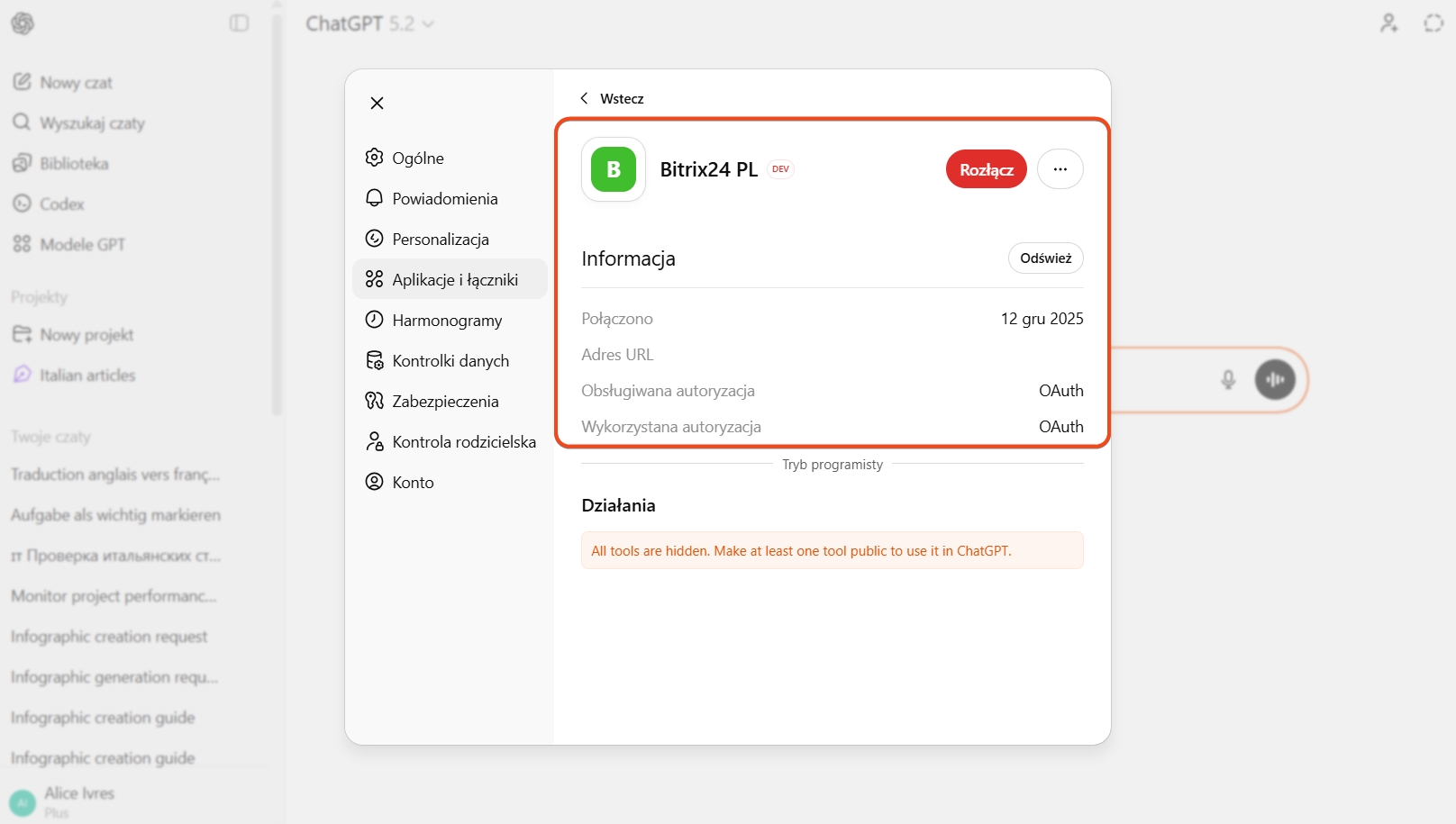 Oto jak podłączyć Bitrix24 do ChatGPT. Ta konfiguracja jest dostępna w abonamentach ChatGPT Plus i Pro.