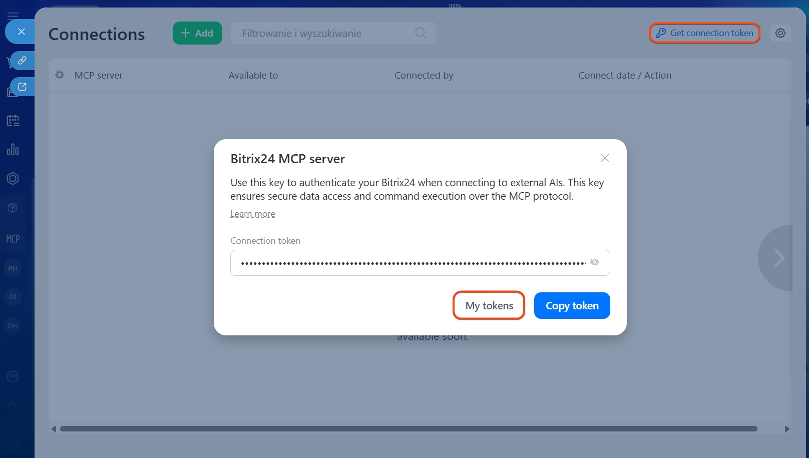 - Możesz odłączyć Bitrix24 od zewnętrznego systemu AI w profilu Bitrix24 Network. Zaloguj się na konto używane do integracji, znajdź połączenie w sekcji Połączenia MCP i kliknij Cofnij dostęp.