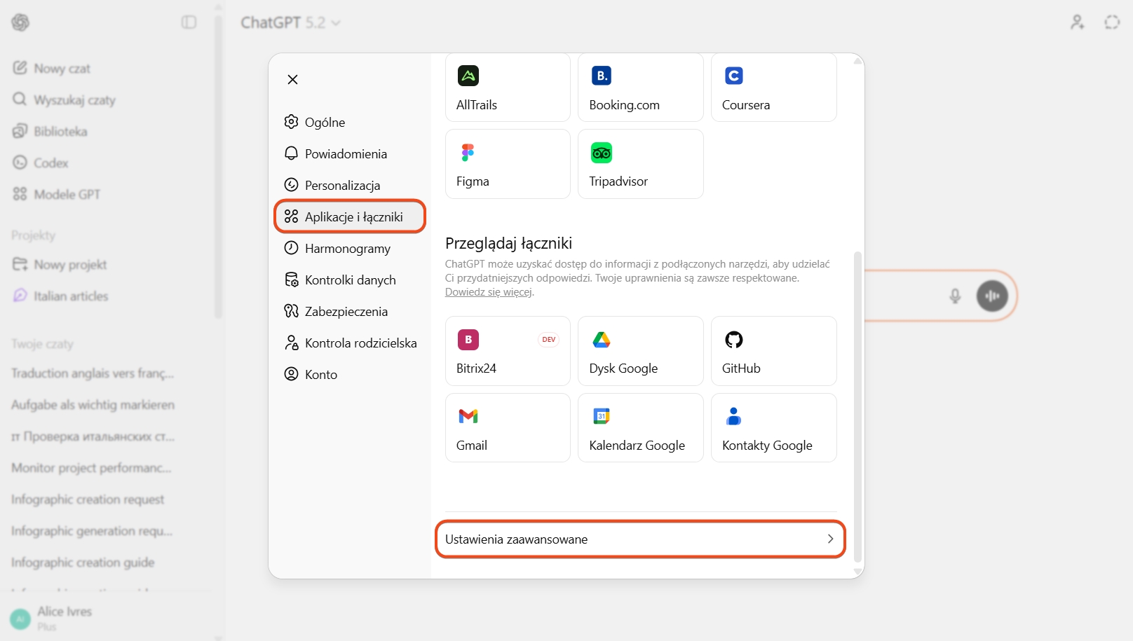 - Kliknij Ustawienia (⚙️) > Aplikacje i łączniki > Ustawienia zaawansowane.