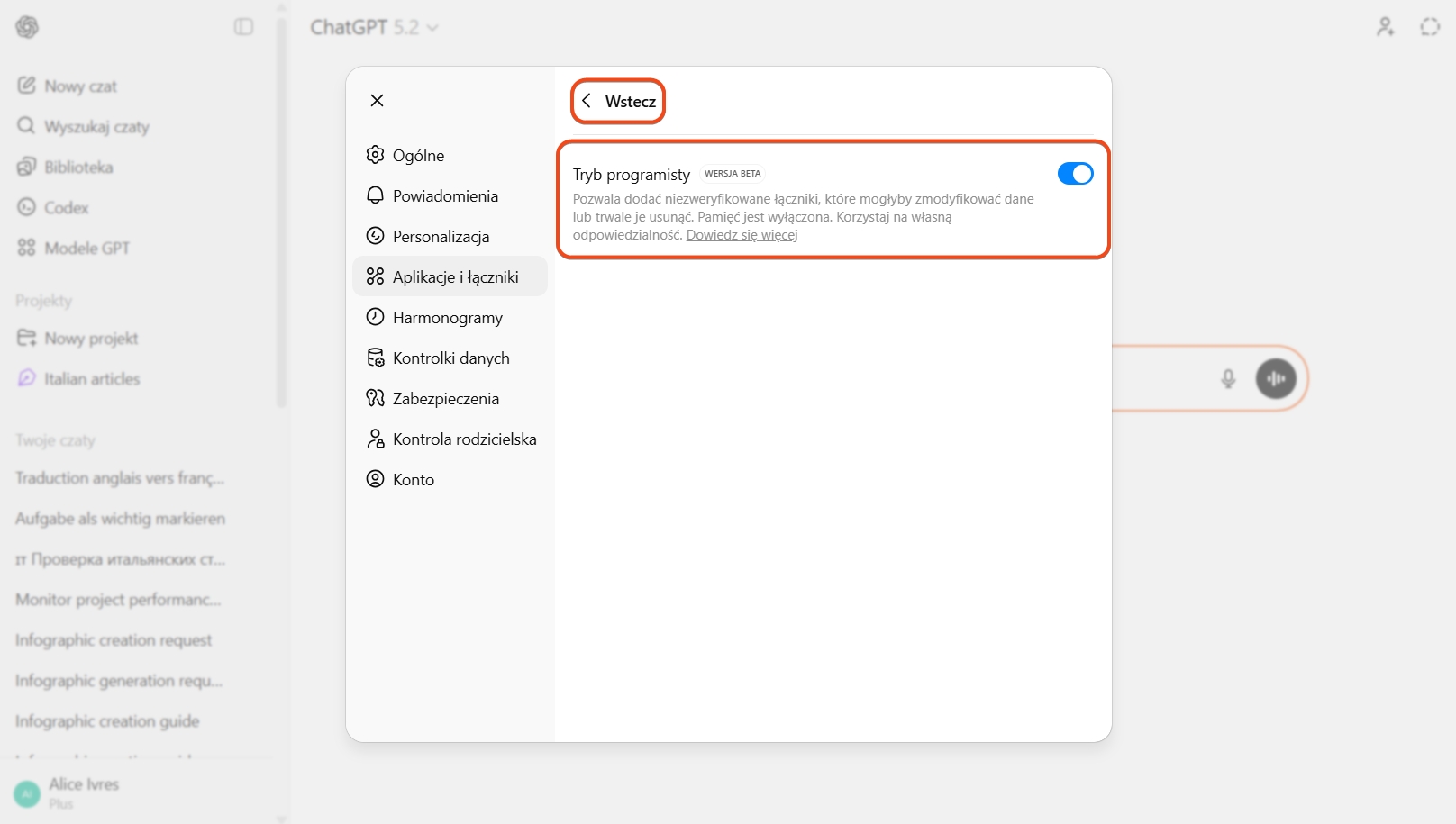 - Włącz lub wyłącz integrację z zewnętrznymi systemami AI