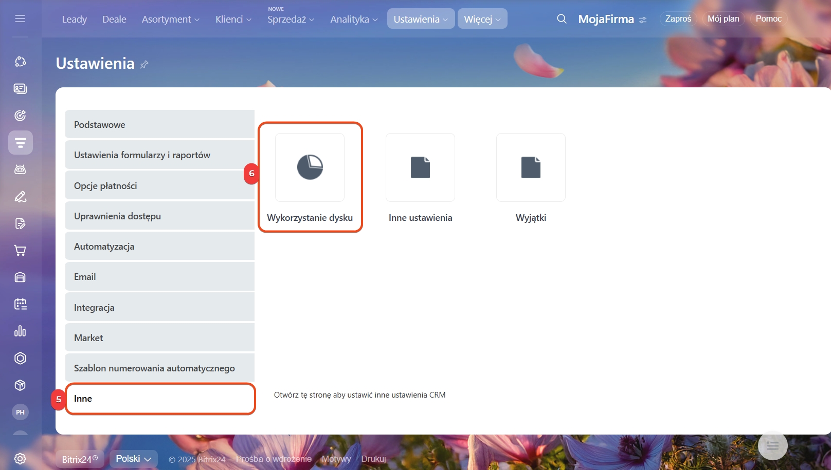 Sekcja Inne zawiera dodatkowe dane, które nie są związane z głównymi elementami CRM, takie jak dane firmowe, formularze CRM i inne zapisy.