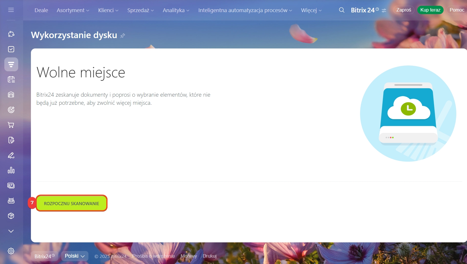 W przypadku wyczerpania przestrzeni dyskowej w Bitrix24, system uniemożliwia tworzenie nowych leadów, deali, kontaktów oraz innych elementów. Aby rozwiązać ten problem, zalecamy skorzystanie z narzędzia Oczyszczanie CRM. Umożliwia ono szybką identyfikację rekordów zajmujących przestrzeń oraz bezpieczne usunięcie zbędnych danych, takich jak zarchiwizowane deale czy nieaktualne leady.