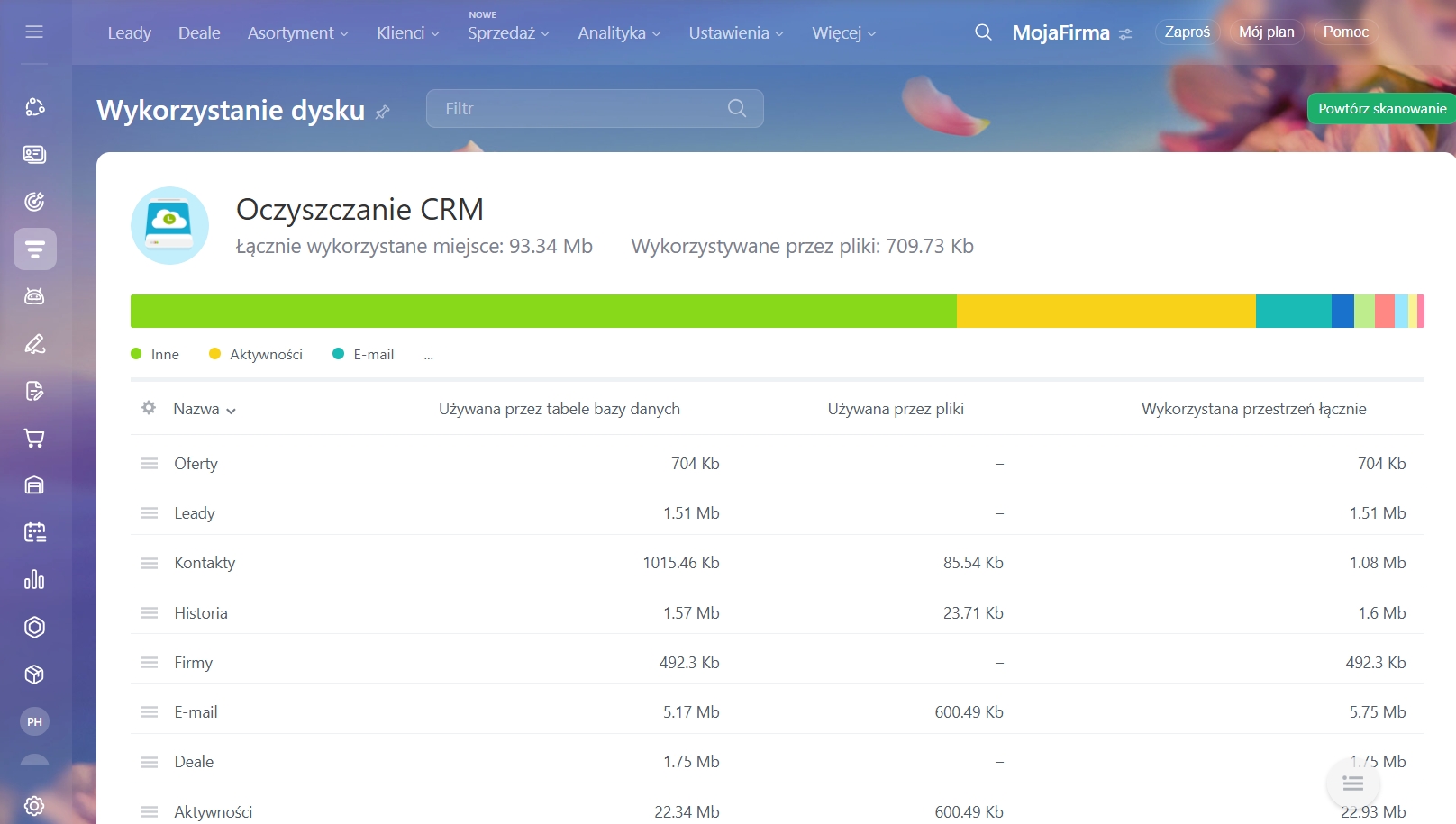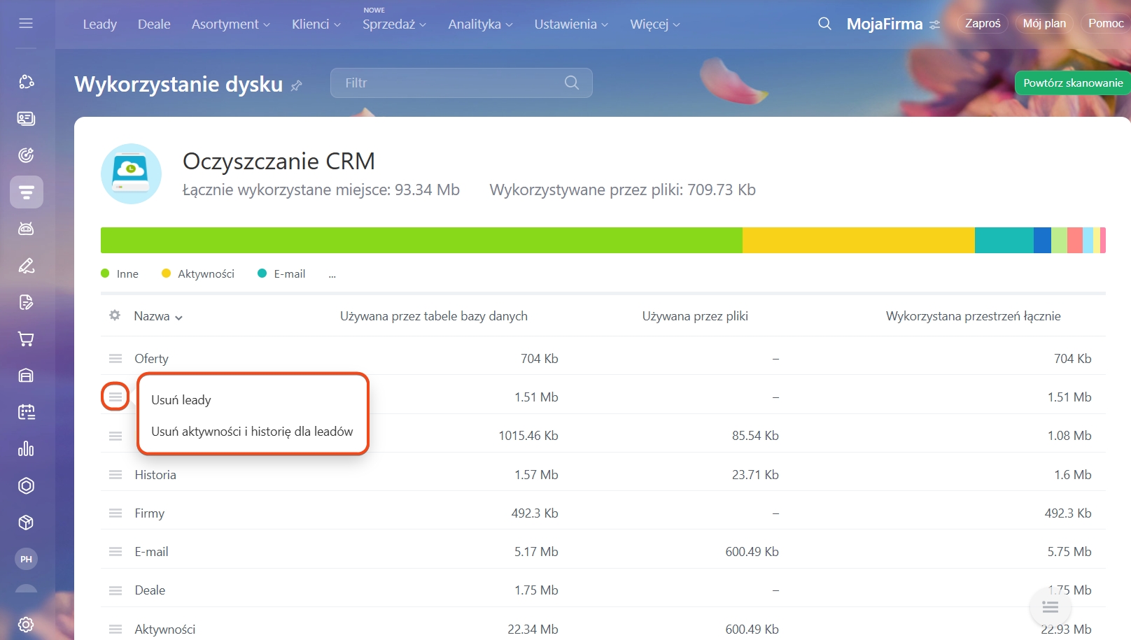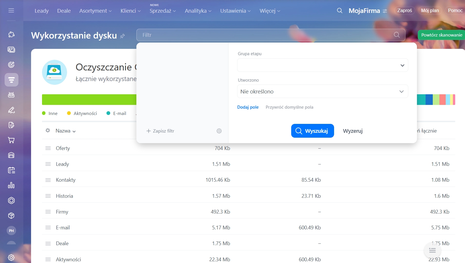 Po zakończeniu skanowania zobaczysz tabelę z wynikami, która pokaże, jakie dane zajmują miejsce. Na jej podstawie możesz zdecydować, co usunąć — na przykład nieaktualne deale z dokumentami lub zadania.