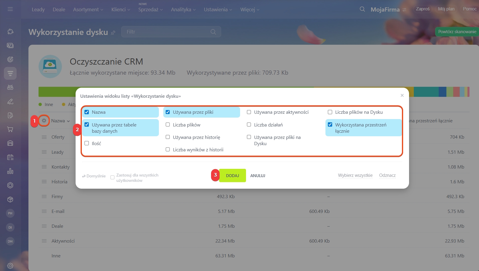 Możesz dostosować widoczne kolumny w tabeli, aby dokładniej określić, które sekcje zajmują najwięcej miejsca i co warto usunąć w pierwszej kolejności. Na przykład deale z dokumentami lub leady z zadaniami i wiadomościami.
