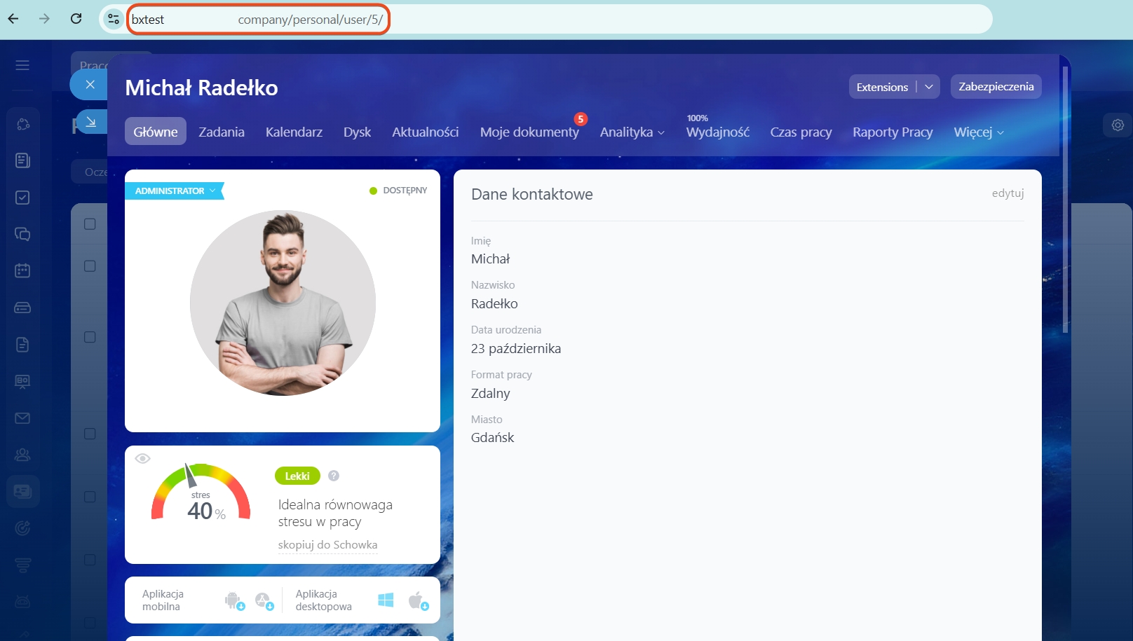 W Bitrix24 każdy pracownik ma swój profil osobisty i widżet. W profilu wyświetlane są podstawowe informacje o pracowniku: dział, stanowisko, kontakty, zainteresowania. Za pomocą widżetu można zarządzać swoim kontem — zmienić hasło, sprawdzić pozostały urlop, zmienić motyw graficzny i inne ustawienia. W tym artykule zebraliśmy odpowiedzi na często zadawane pytania dotyczące profilu i widżetu pracownika.