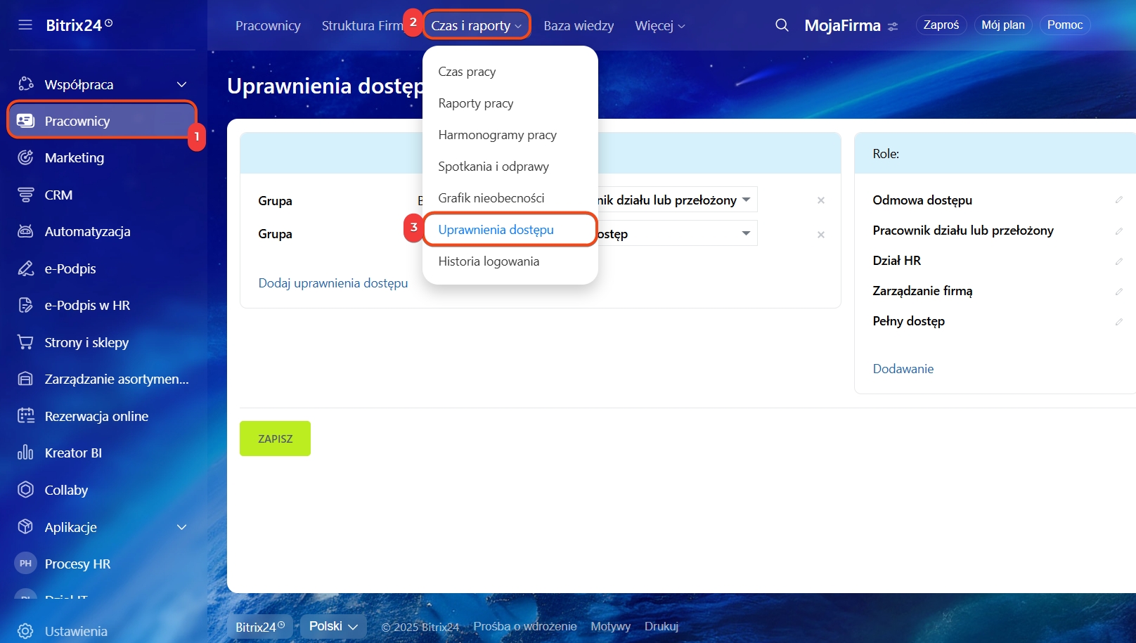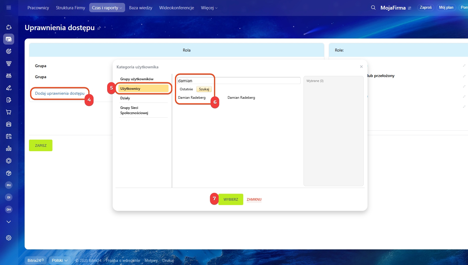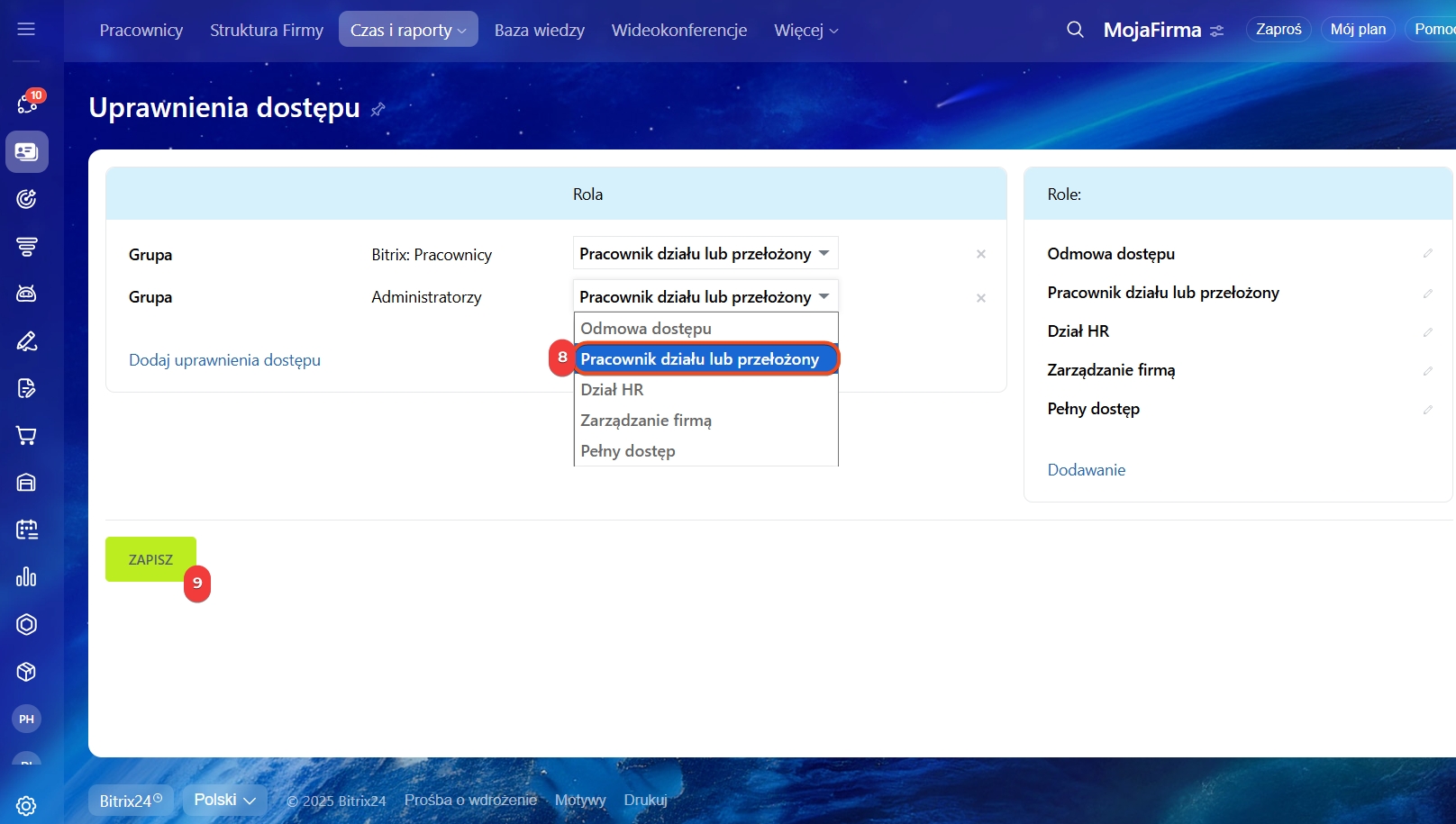 7. Wybierz uprawnienie dostępu Pracownik lub kierownik działu — działa ono różnie w zależności od roli użytkownika w strukturze firmy: