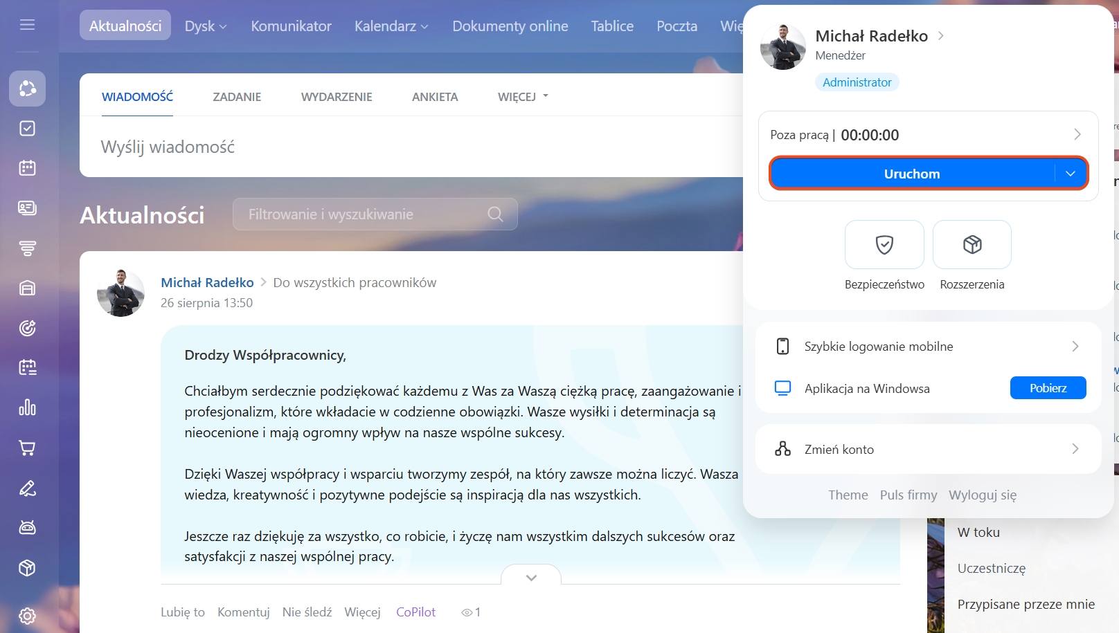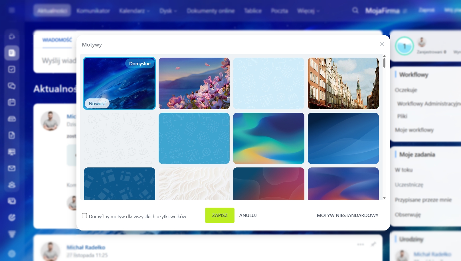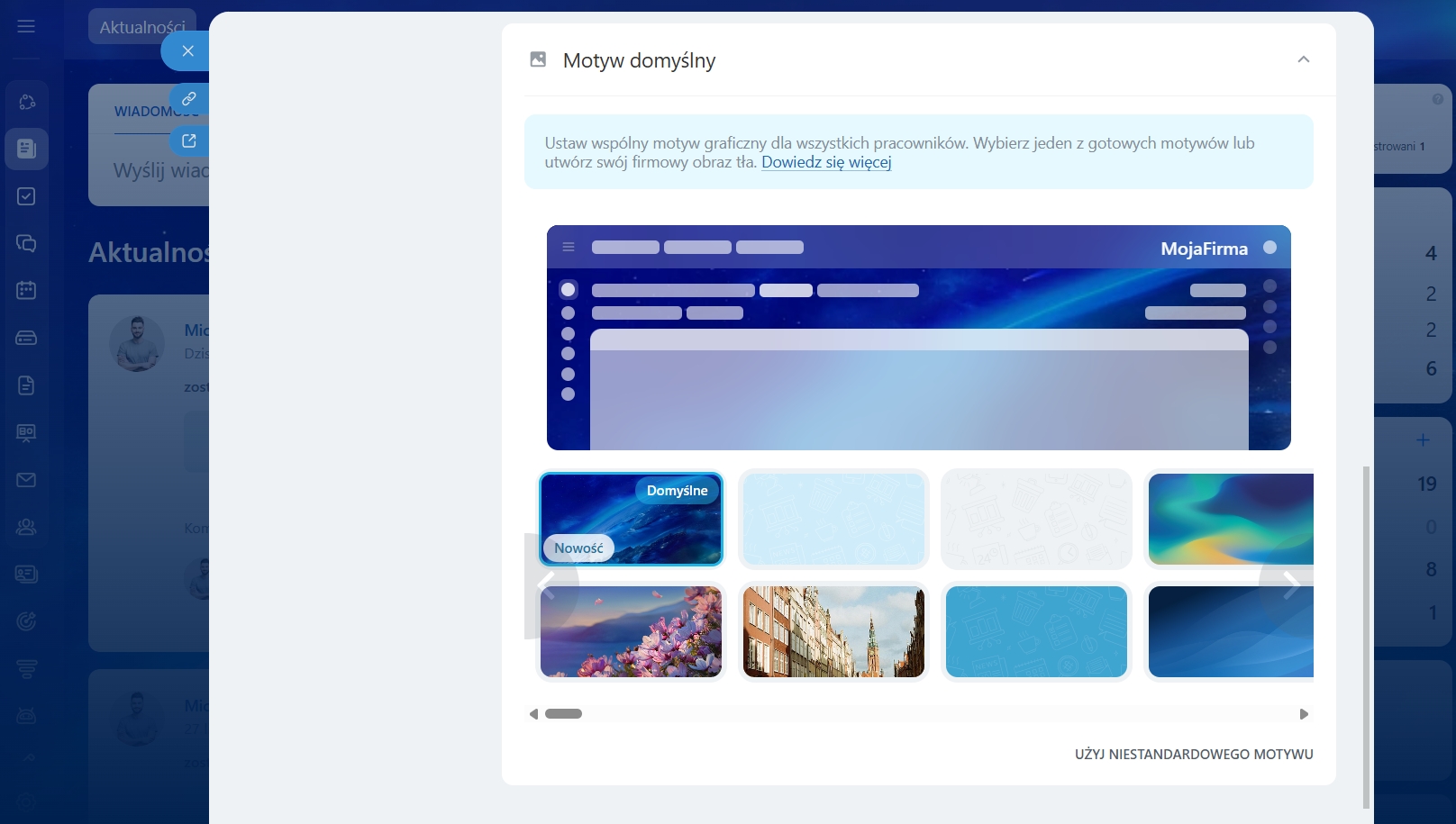 Motyw korporacyjny. Administrator Bitrix24 może włączyć wspólne tło dla wszystkich pracowników. Jeśli administrator zaktualizuje motyw korporacyjny, zmieni się on automatycznie u wszystkich.