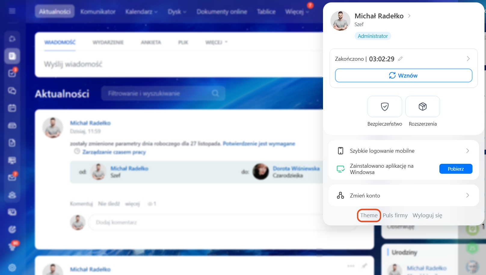 Możesz przywrócić poprzedni motyw lub ustawić nowy tylko dla siebie. Przejdź do widżetu pracownika i wybierz Motyw.
